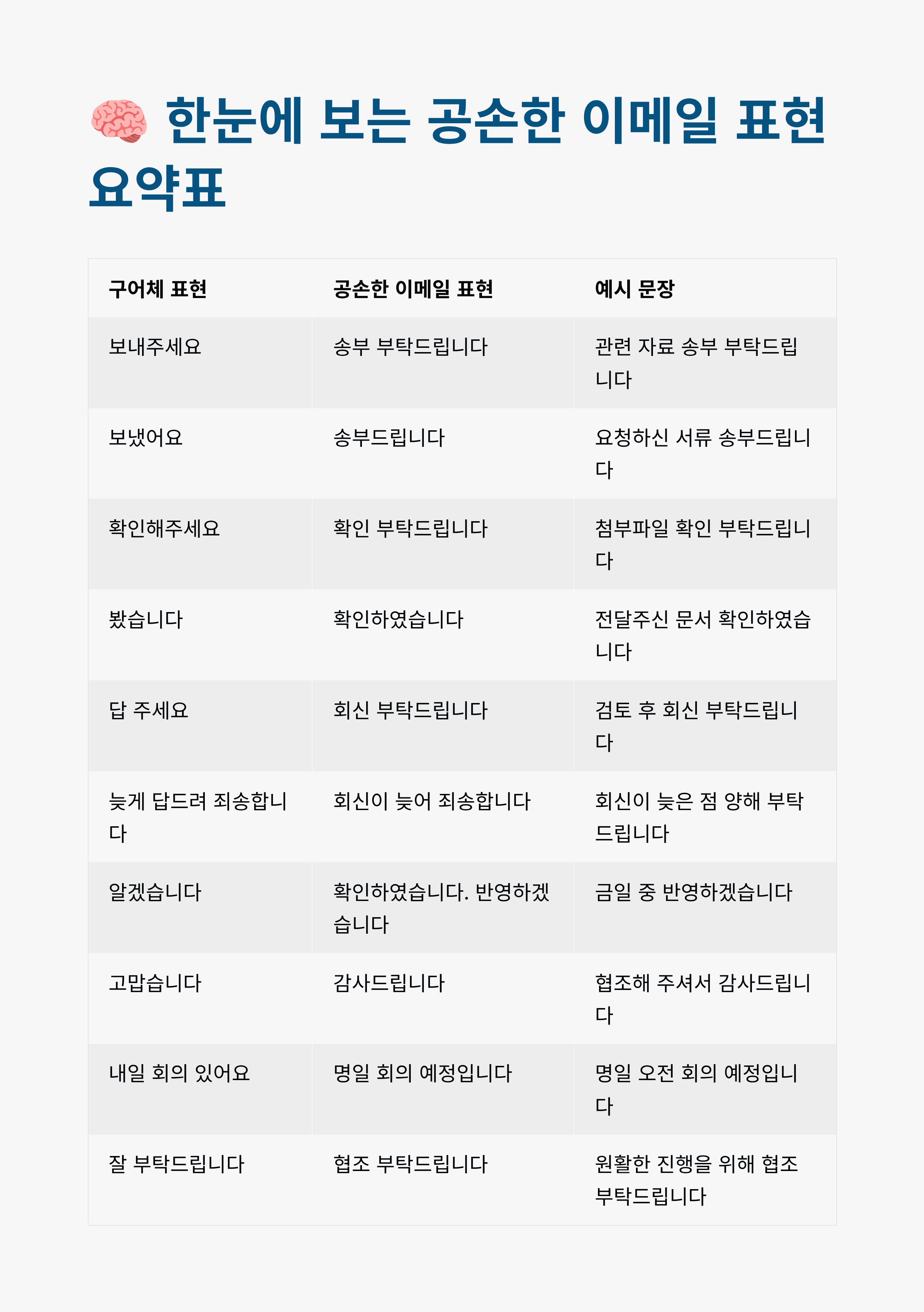 🧠 한눈에 보는 공손한 이메일 표현 요약표