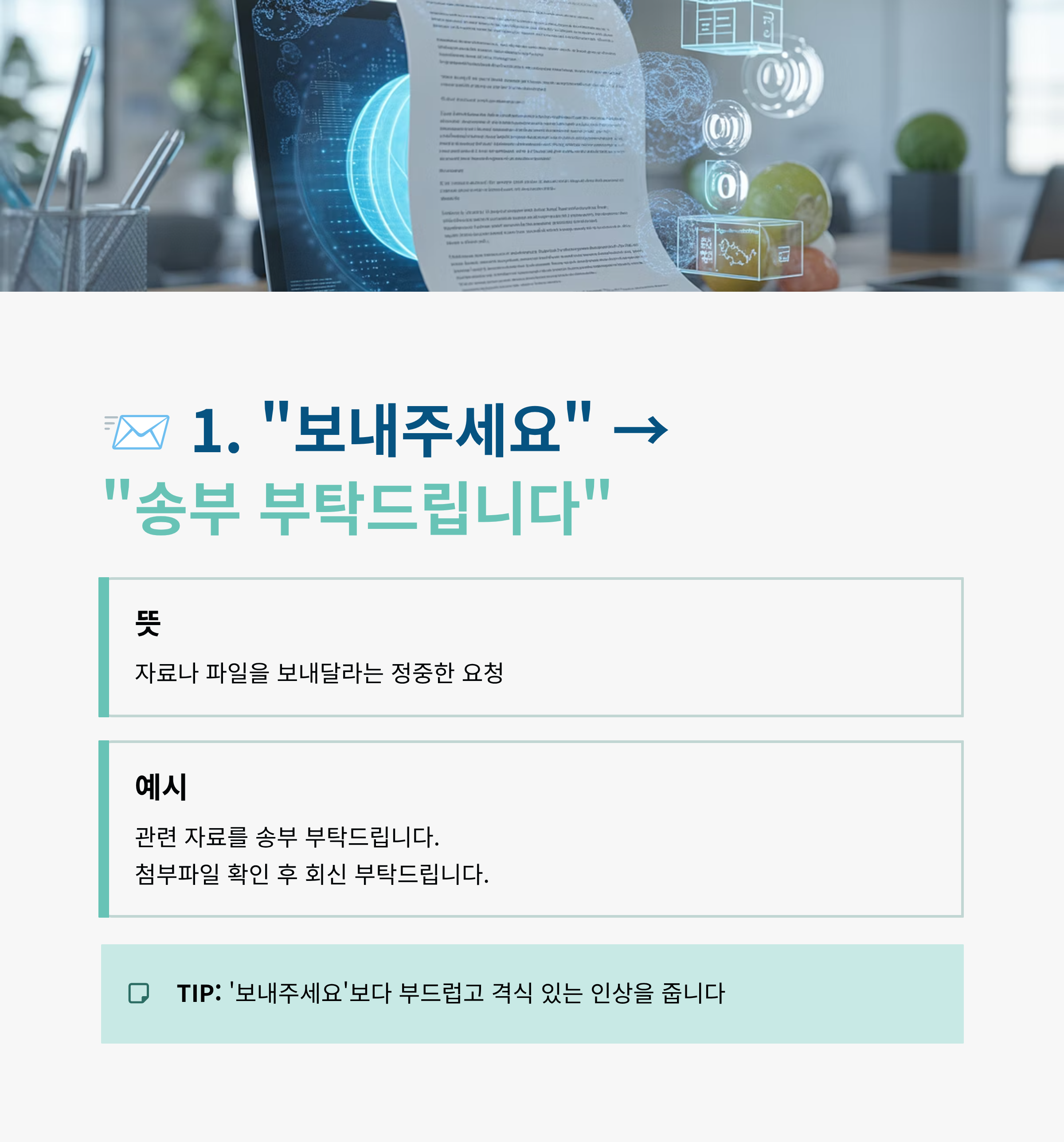 📨 1. “보내주세요” → “송부 부탁드립니다.”
