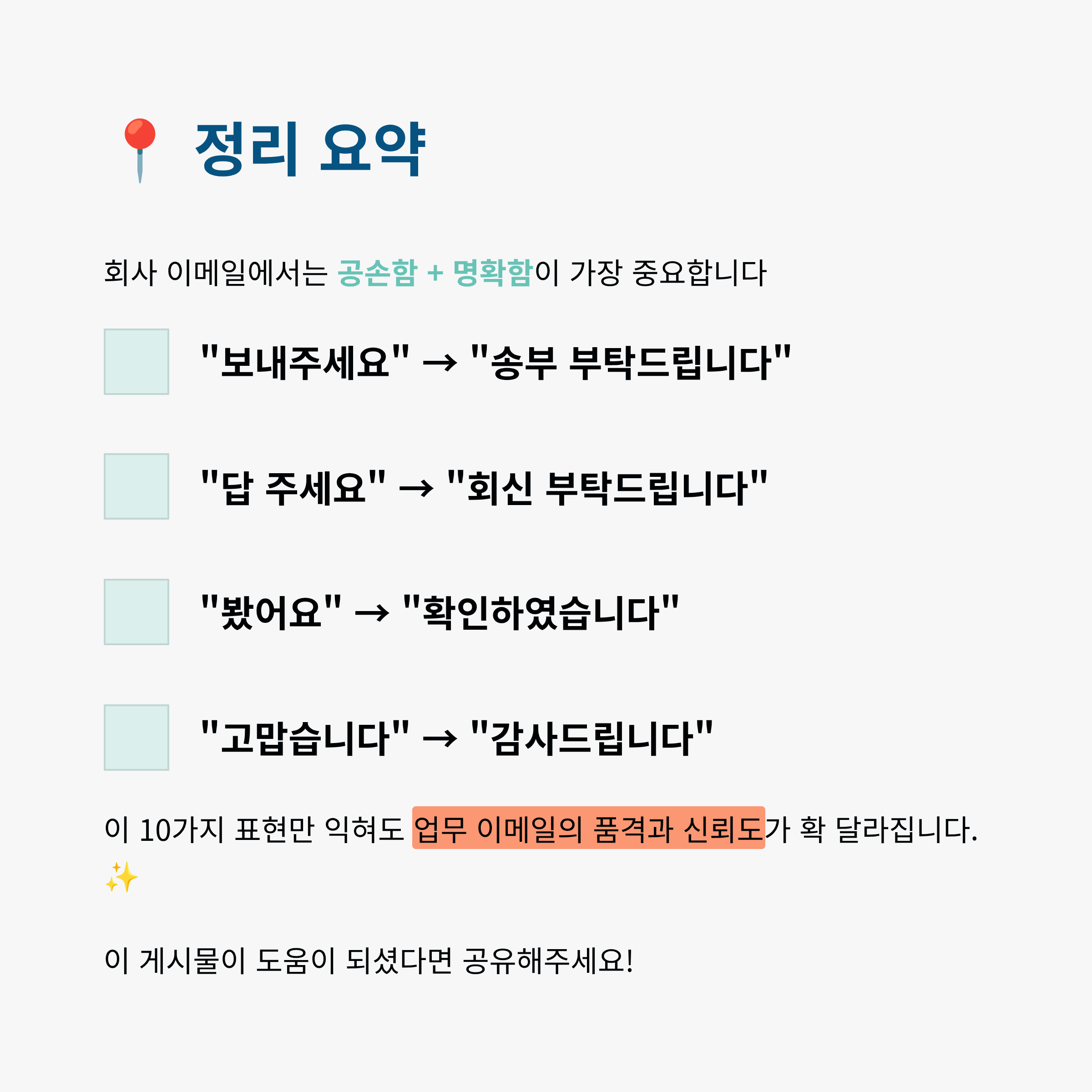 - 회사 이메일에서는 공손함 + 명확함이 가장 중요