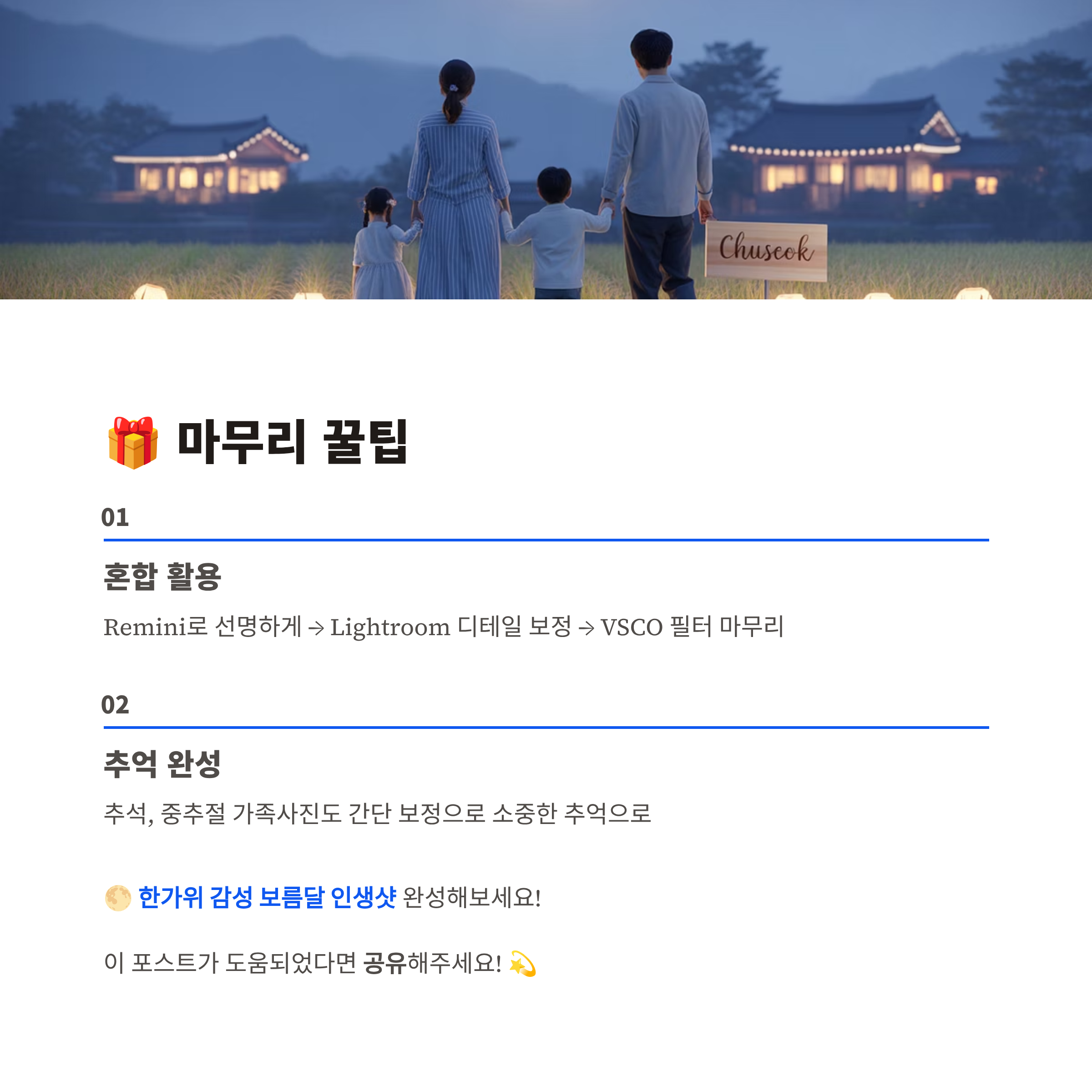 예: Remini로 선명하게 → Lightroom에서 디테일 보정 → VSCO 필터로 마무리 - 추석, 중추절, 보름달을 배경으로 아이와 함께 찍은 사진도 간단한 보정만으로 소중한 추억으로 완성됩니다.