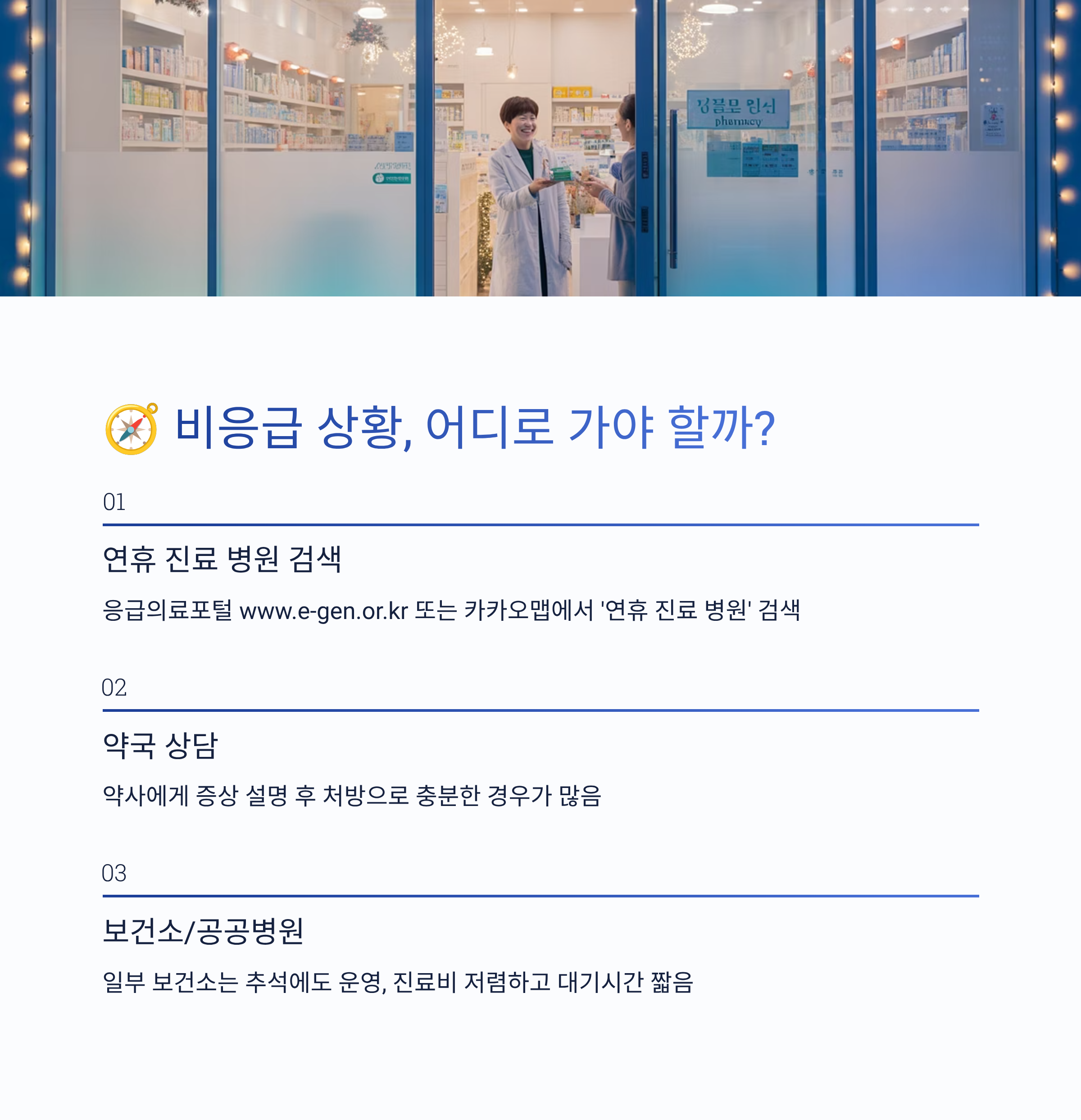 - 카카오맵 / 네이버지도 → ‘연휴 진료 병원’ 검색