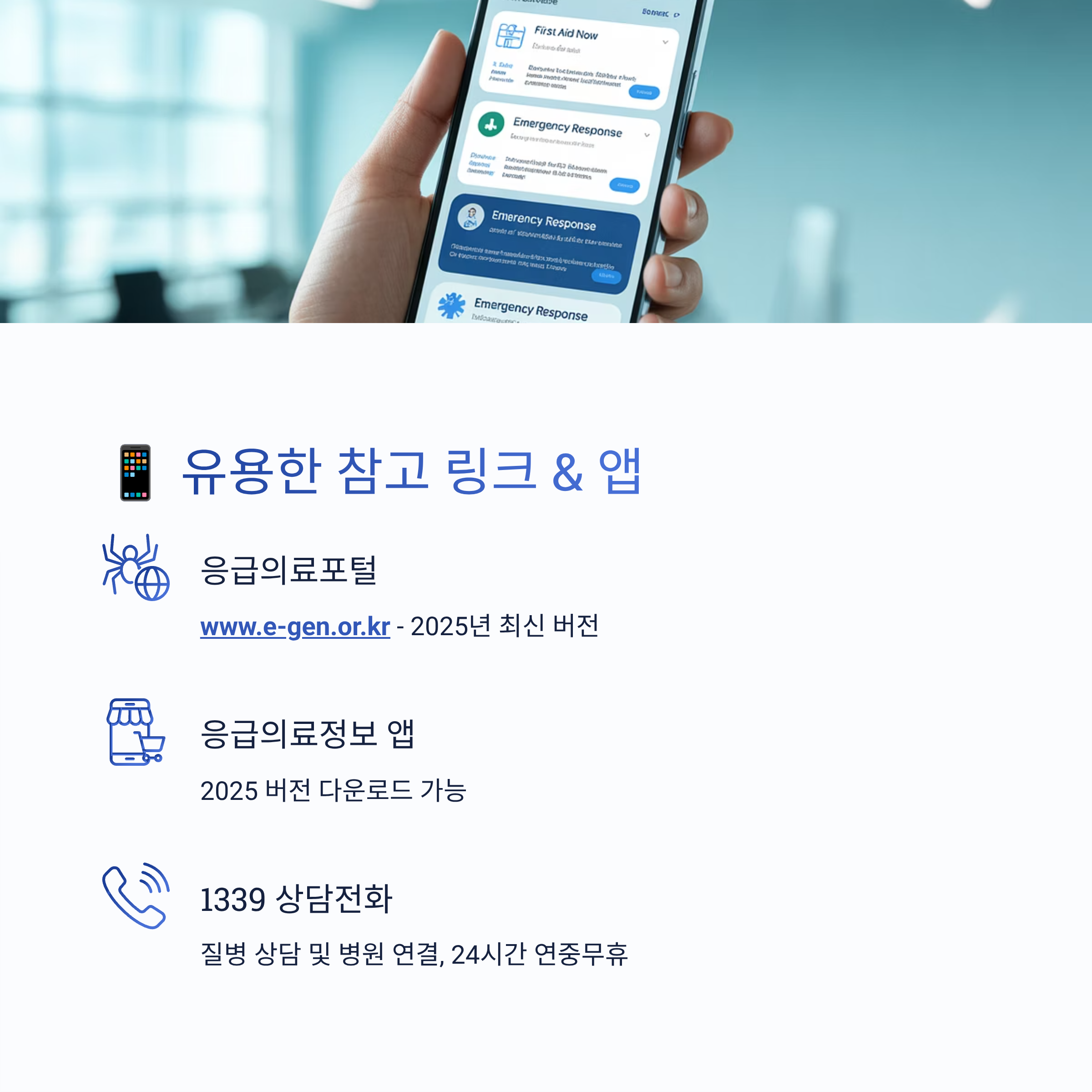 - 📞 1339 (질병 상담 및 병원 연결 가능, 24시간 연중무휴)