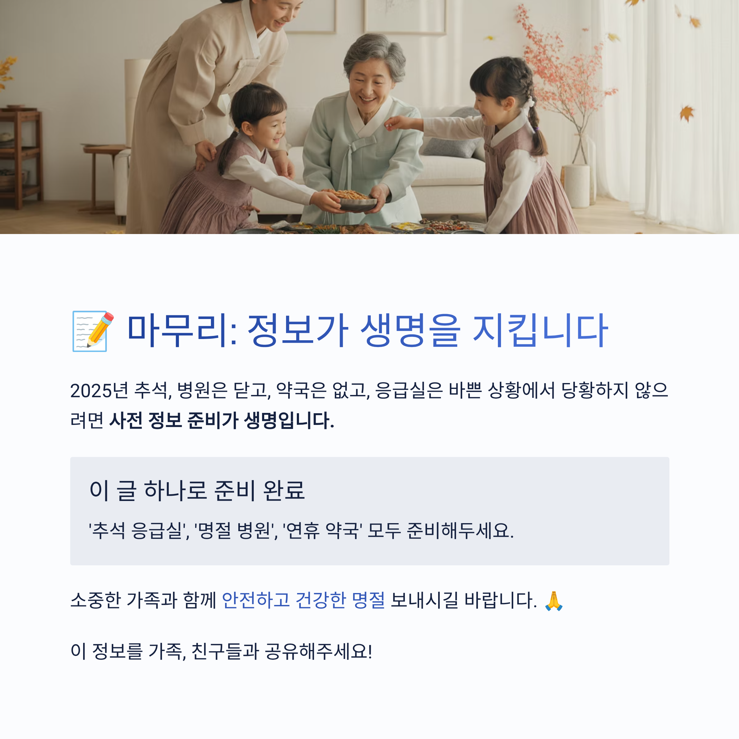 📌 이 글 하나로 '추석 응급실', '명절 병원', '연휴 약국' 모두 준비해두세요.