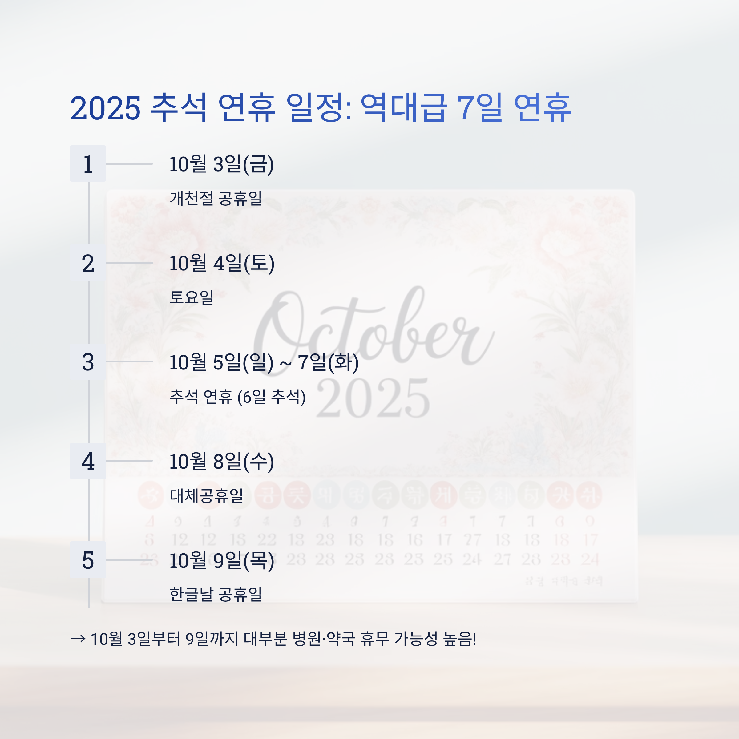 → 10월 3일부터 9일까지 대부분 병원·약국 휴무 가능성 높음!