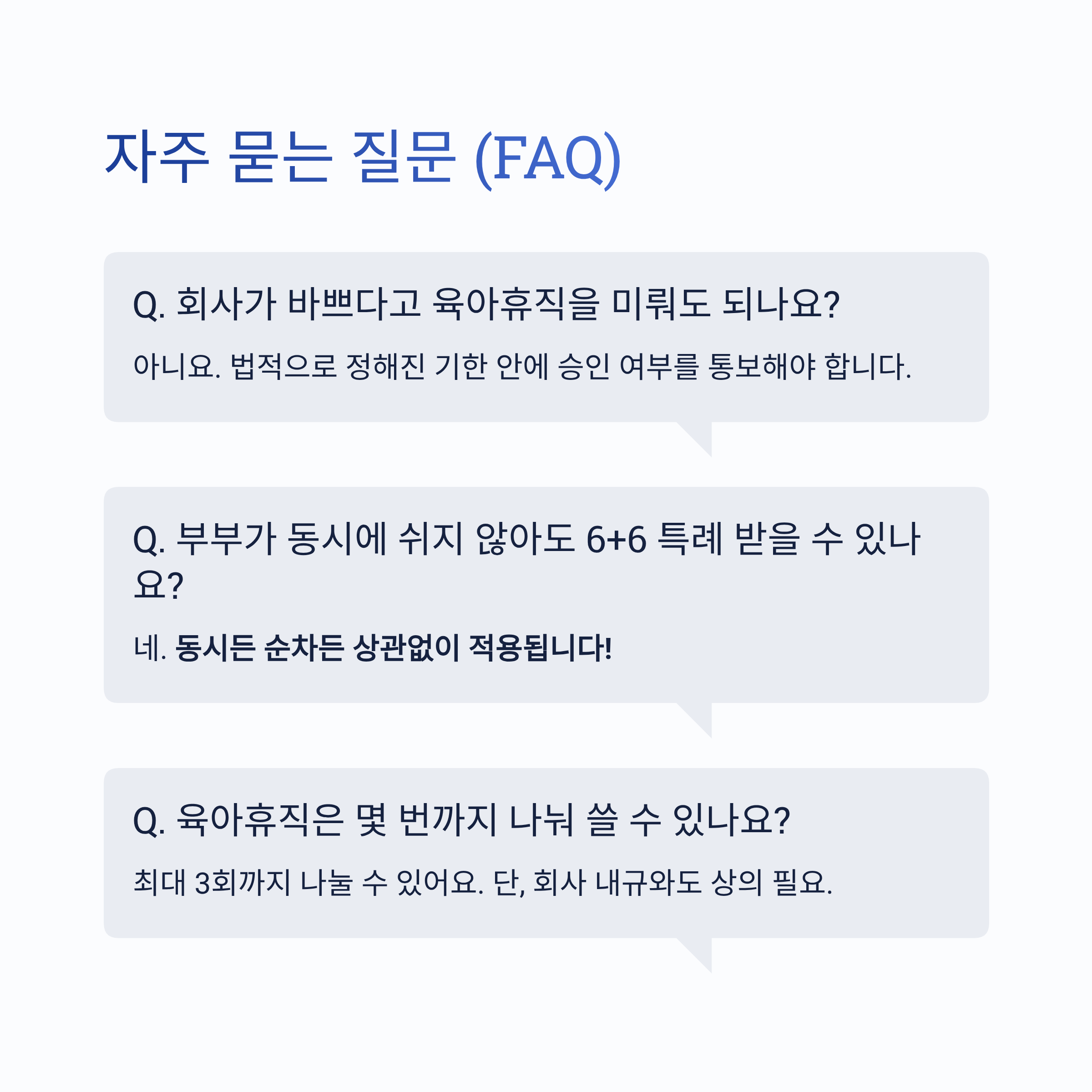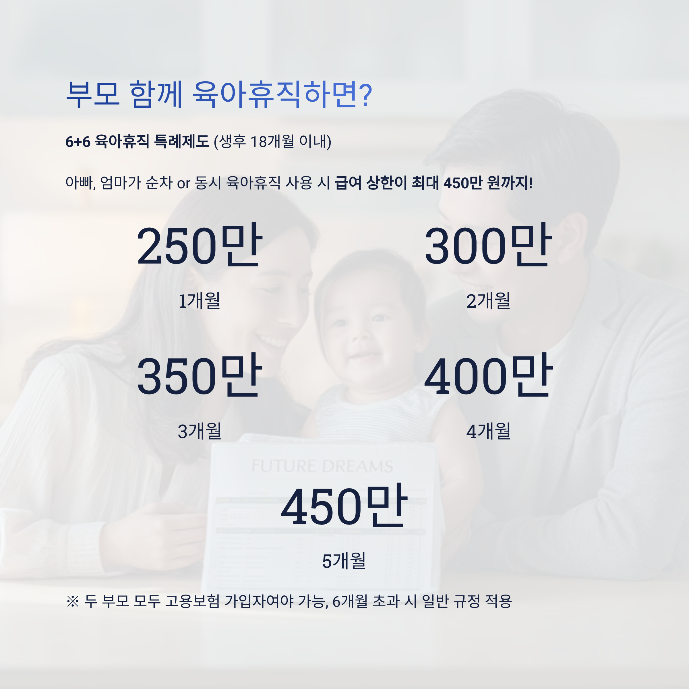 ※ 두 부모 모두 고용보험 가입자여야 가능하며, 6개월 초과 시 다시 일반 규정으로 회귀합니다.