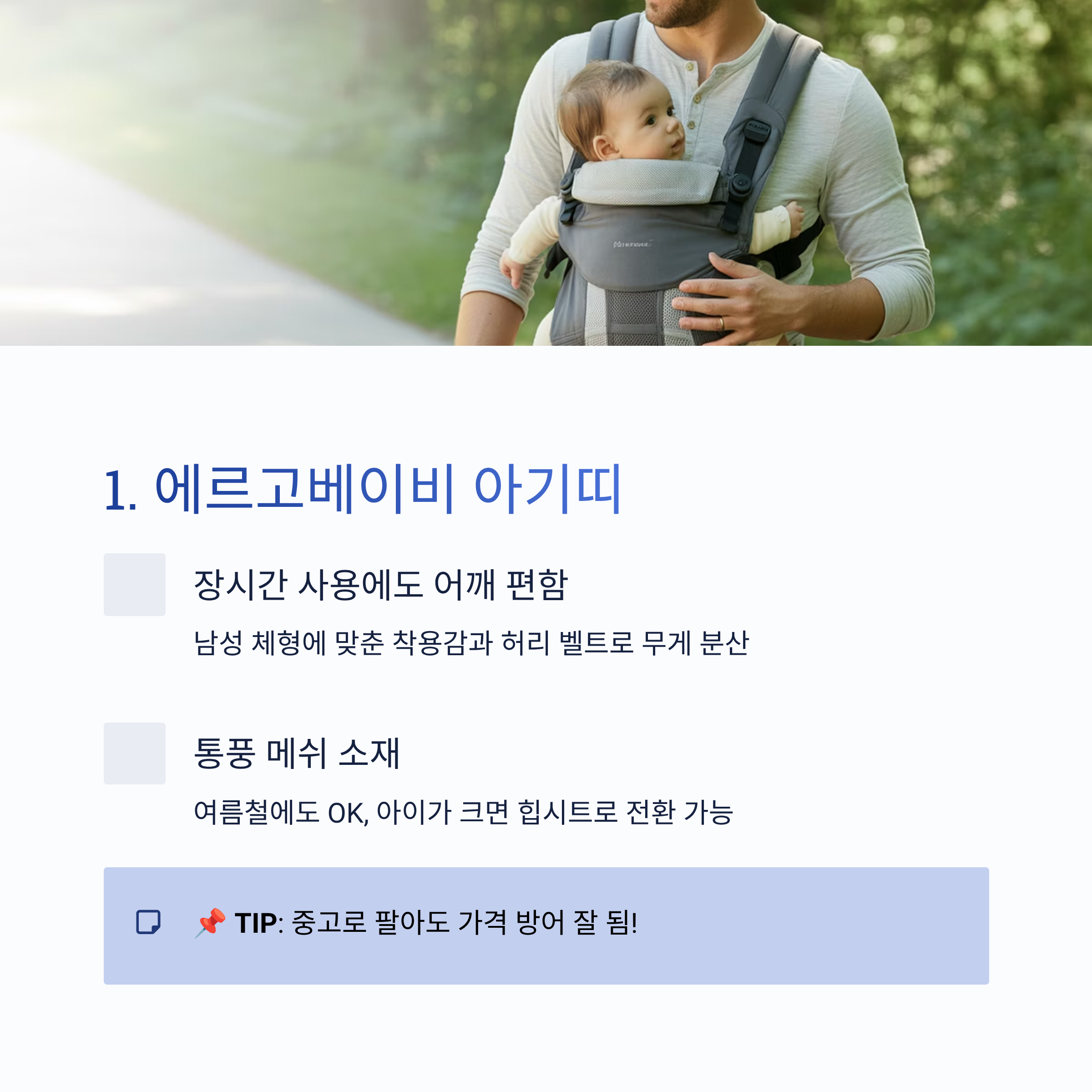 - 아빠 전용 제품 검색 키워드: "남자용 아기띠", "아빠 기저귀 가방" 등으로 검색