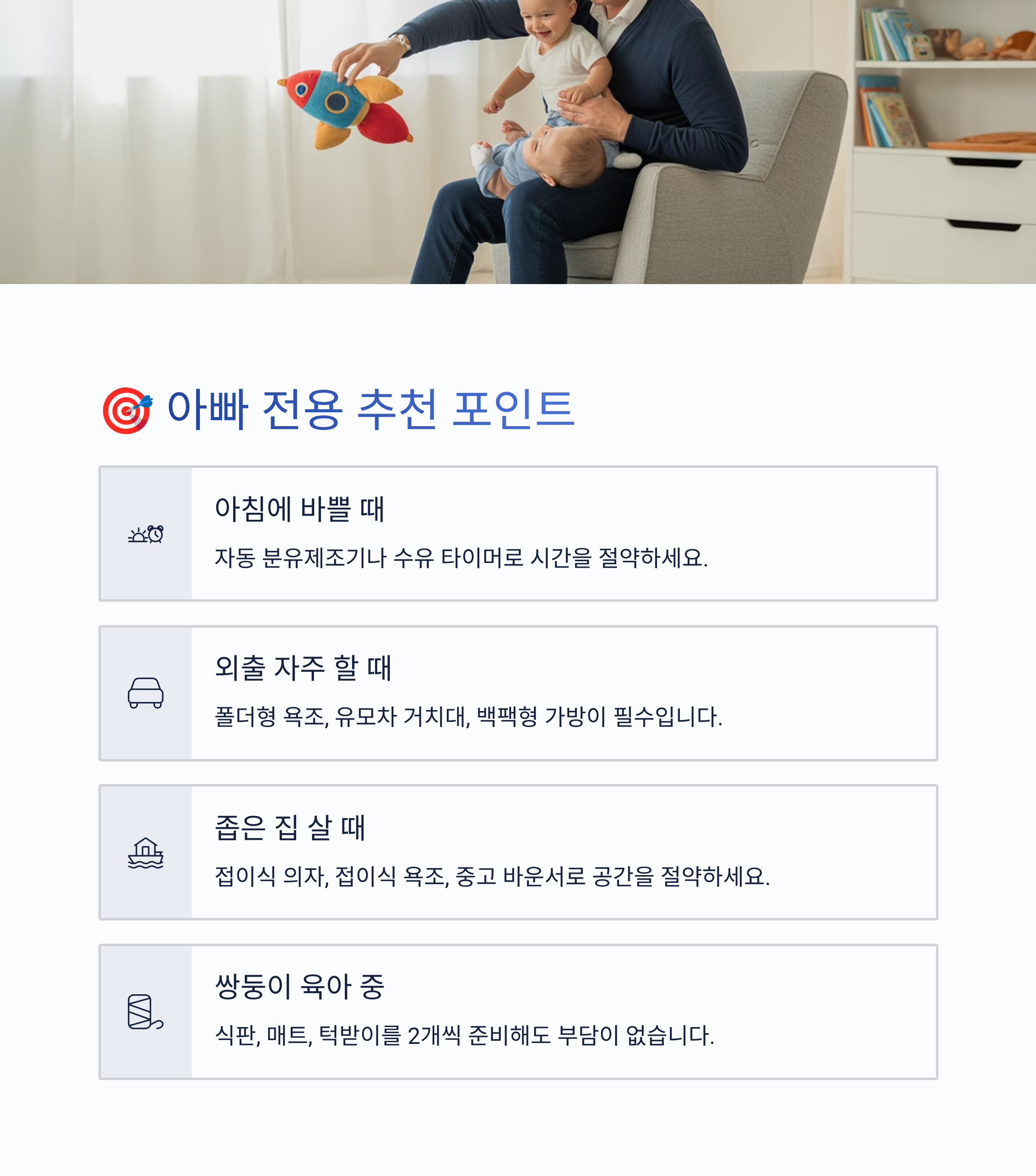 | 외출 자주 할 때 | 폴더형 욕조, 유모차 거치대, 백팩형 가방 |