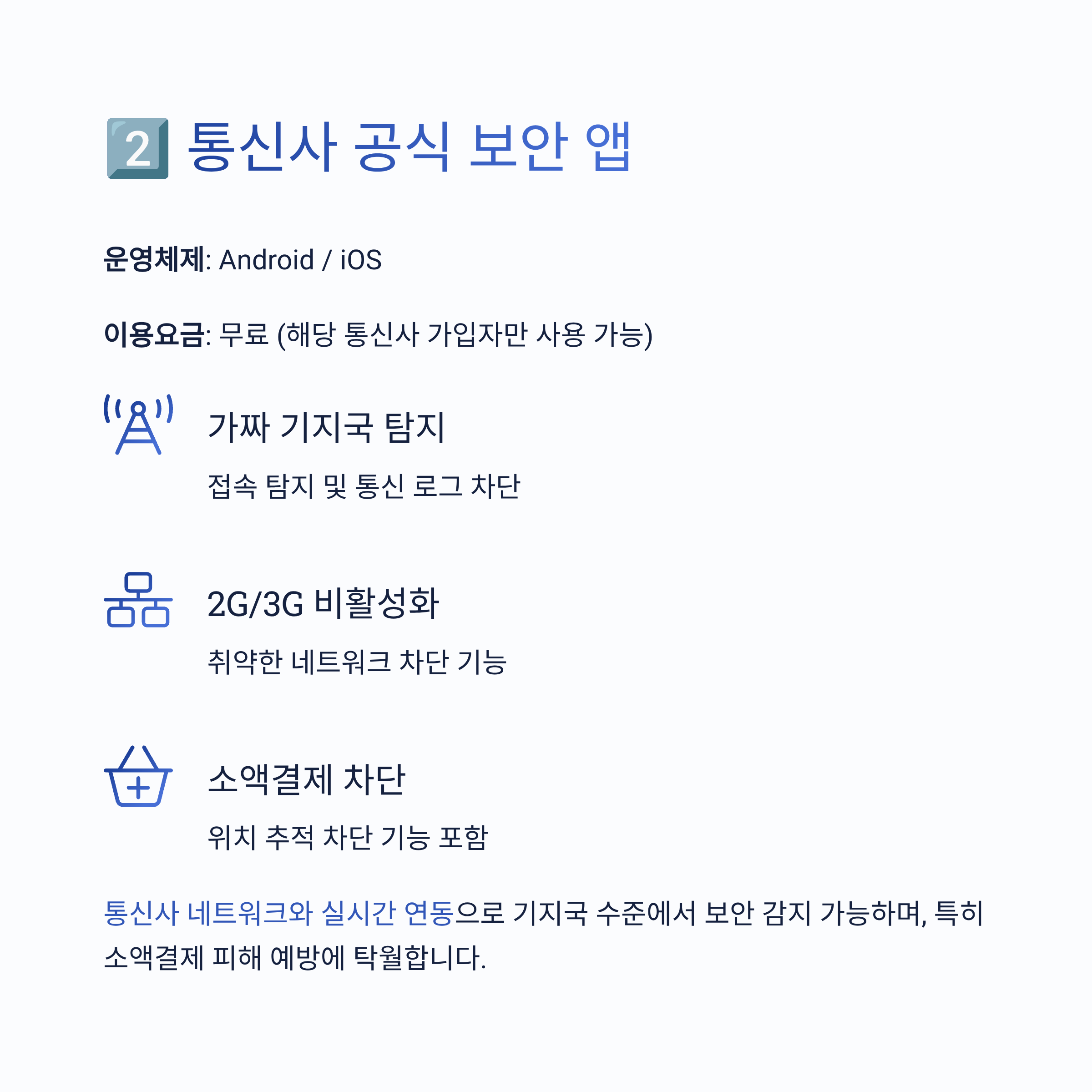 | 기지국 기반 보안 | 통신사 보안 앱 | 2G 차단, 소액결제 차단, 기지국 레벨 감지 |
