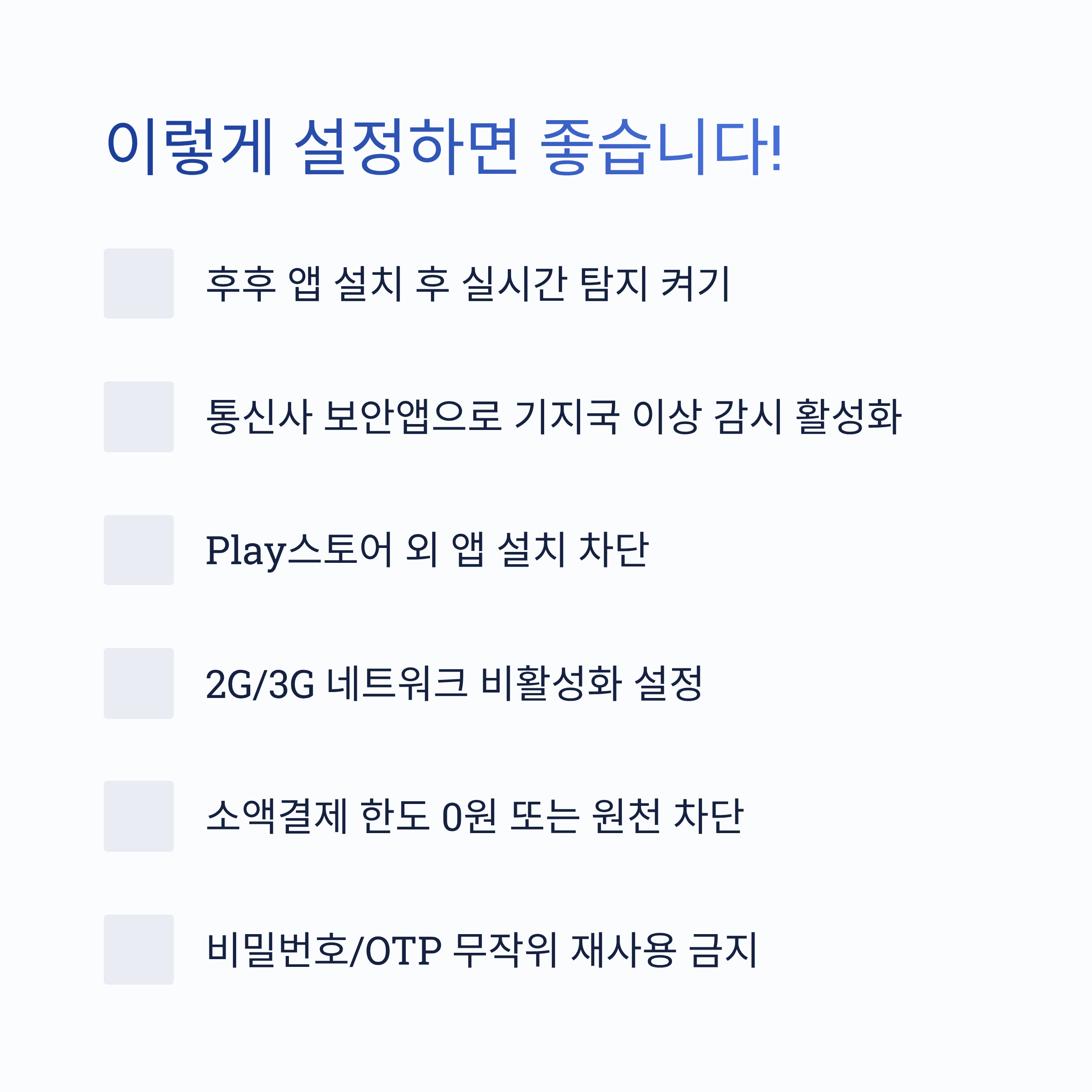 → VPN + 와이파이 + 피싱 대응용 - 2G/3G 수동 비활성화 + 소액결제 원천 차단