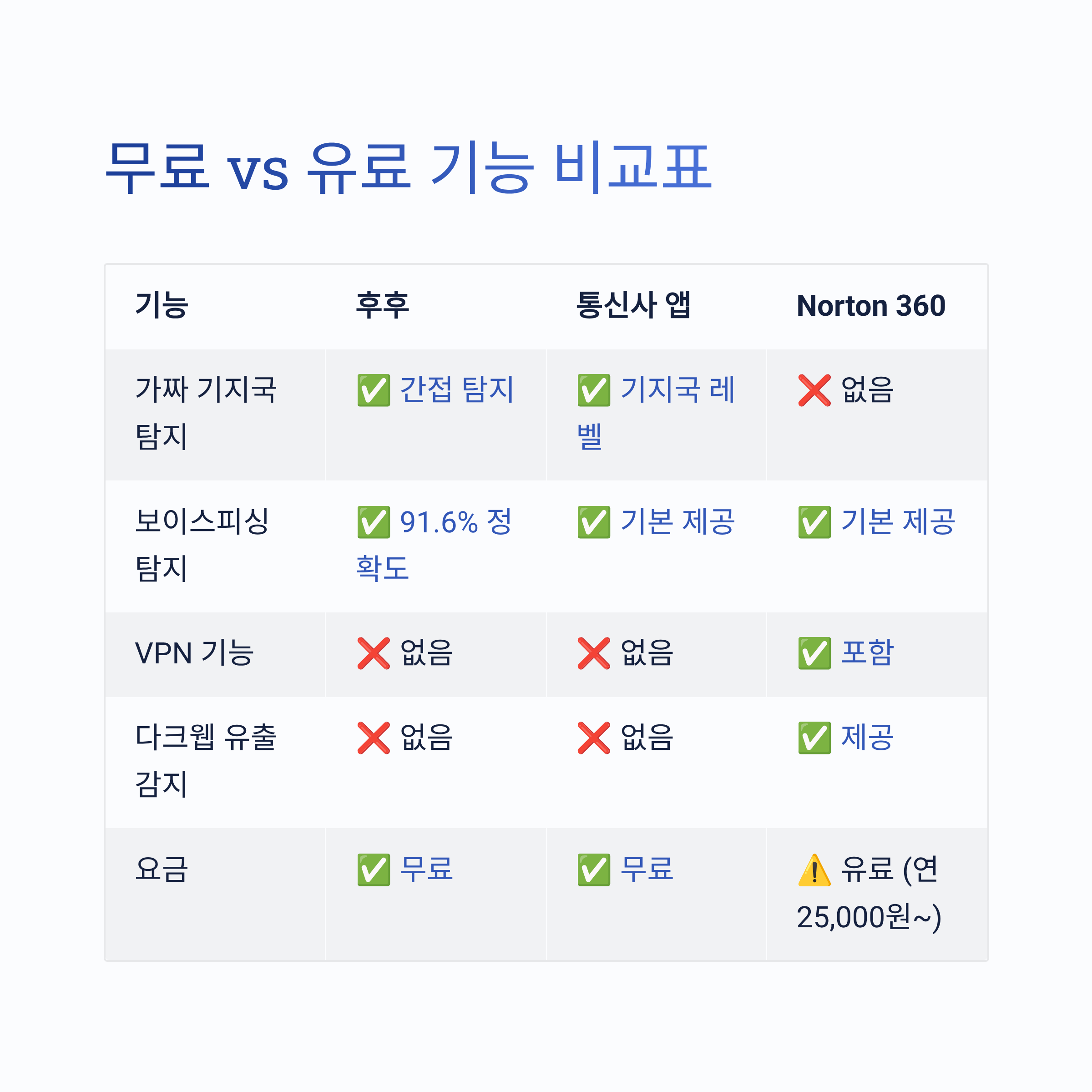 | 보이스피싱 탐지 | ✅ 91.6% 정확도 | ✅ 기본 제공 | ✅ 기본 제공 |