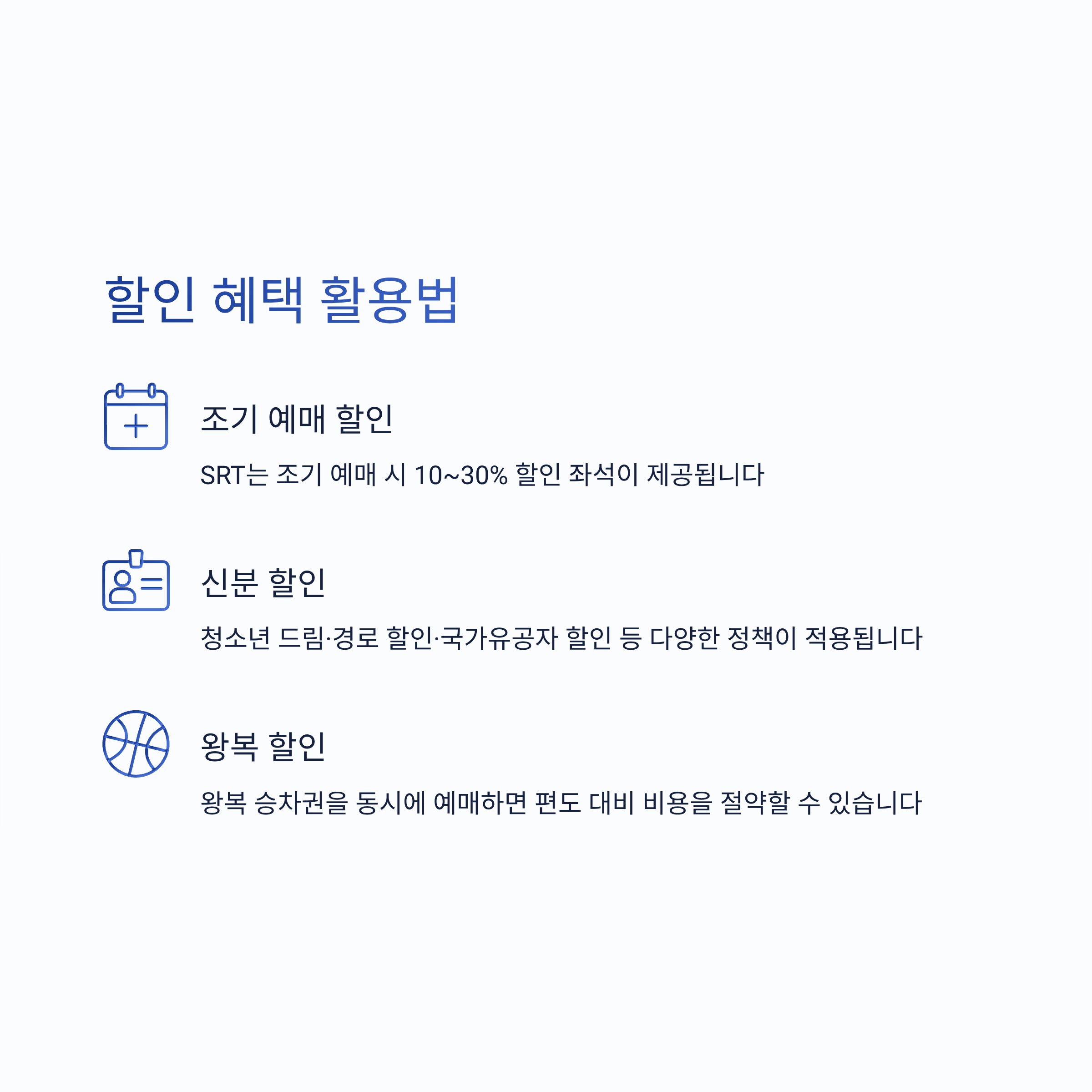 SRT는 조기 예매 시 10~30% 할인 좌석이 제공되며,