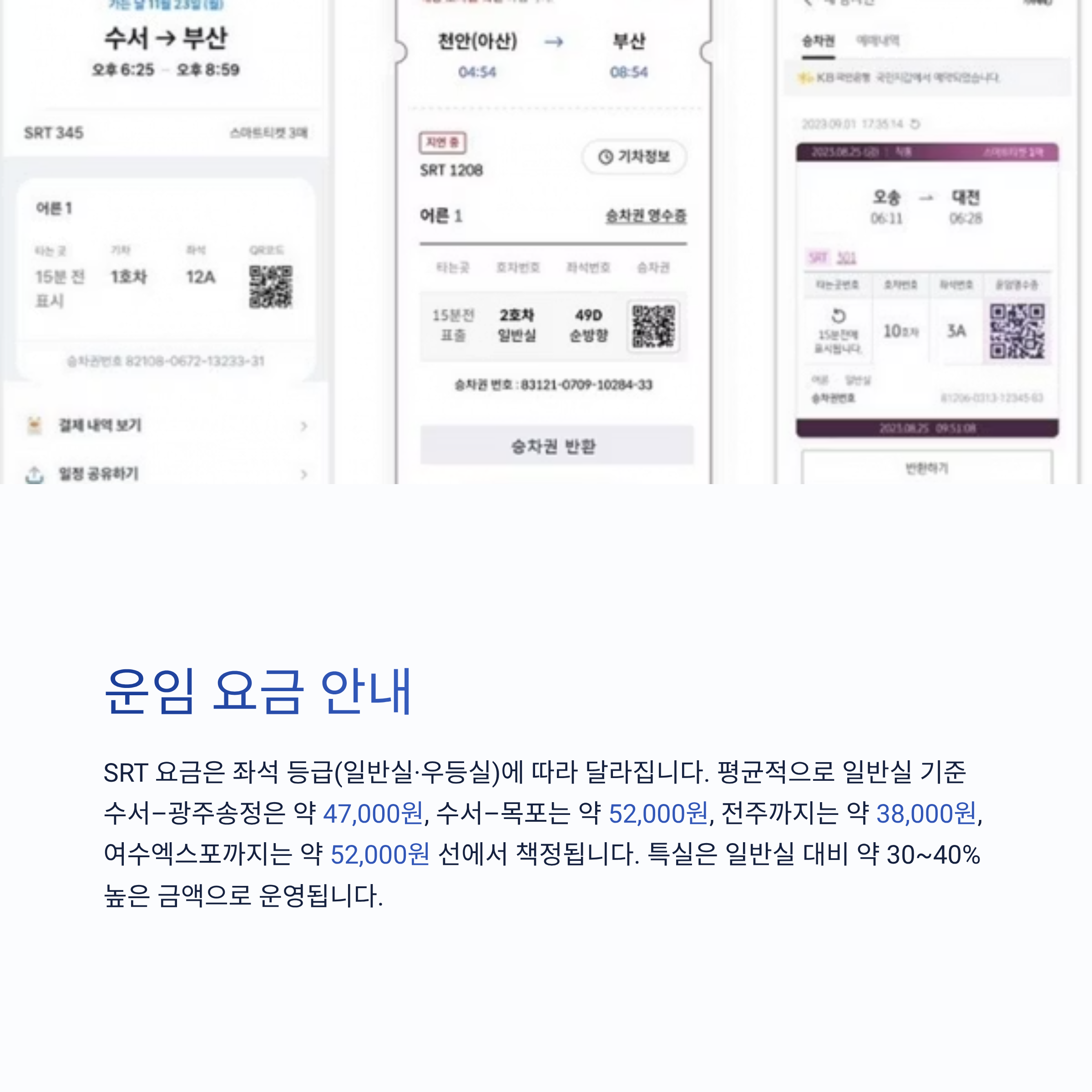 수서–목포는 약 52,000원, 전주까지는 약 38,000원,