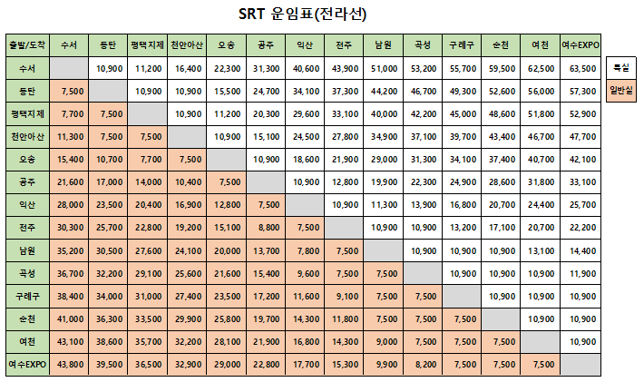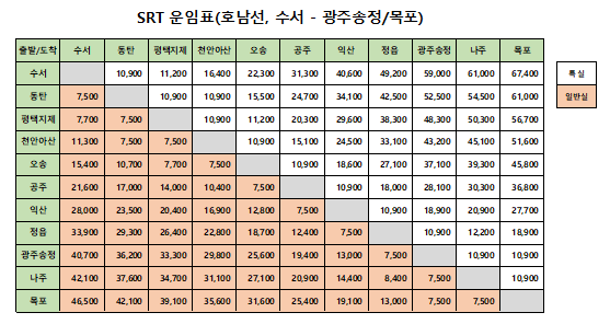 SRT 요금은 좌석 등급(일반실·우등실)에 따라 달라집니다.