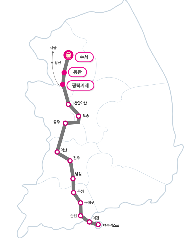 SRT 수서역에서 출발하는 호남선과 전라선은 남부 지역으로 향하는