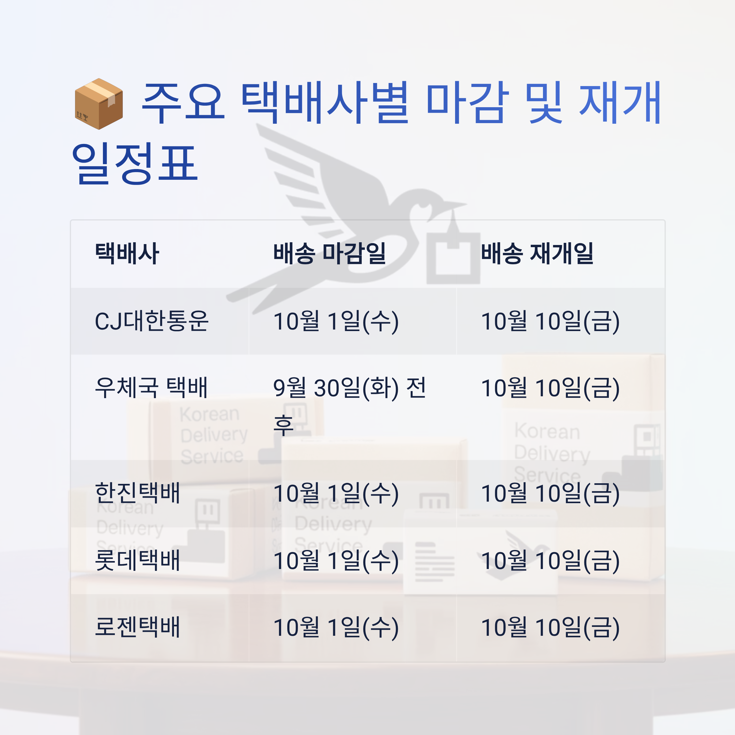주요 택배사들의 2025년 추석 배송 마감 및 재개 일정을 한눈에 정리해드릴게요.