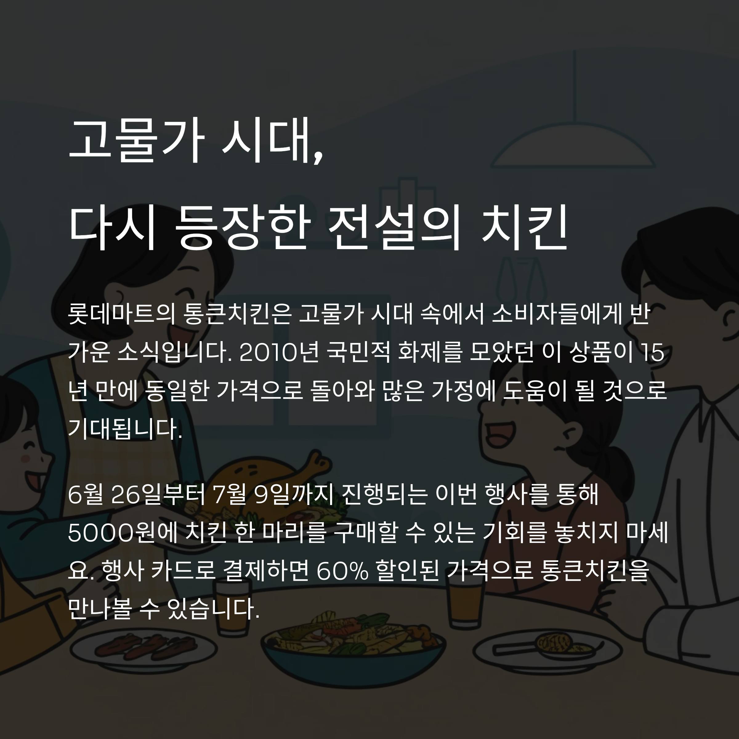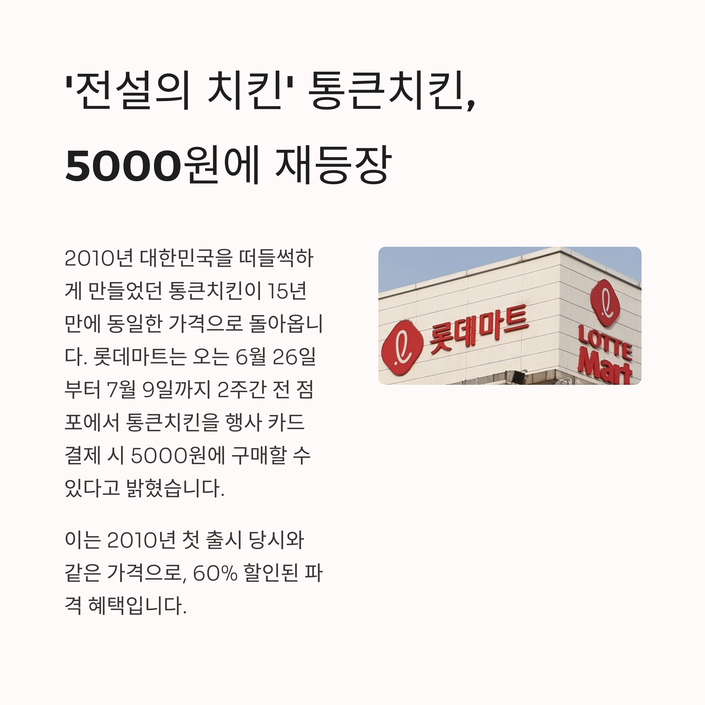 롯데마트가 15년 전 가격 그대로 ‘통큰치킨’을 다시 판매합니다. 2010년 국민적 화제를 모았던 5000원짜리 치킨이 2025년 여름, 다시 한번 소비자 곁으로 돌아왔습니다. 고물가 시대 속 가계 부담을 줄이기 위한 파격적인 ‘통큰세일’의 대표 상품으로 선보이는 이번 이벤트는 치킨을 비롯해 한우, 수박, 랍스터 등 다양한 상품을 최대 60% 할인해 판매합니다. 어떤 제품들이 포함됐고, 구매 조건은 무엇인지 지금 바로 확인해보세요.