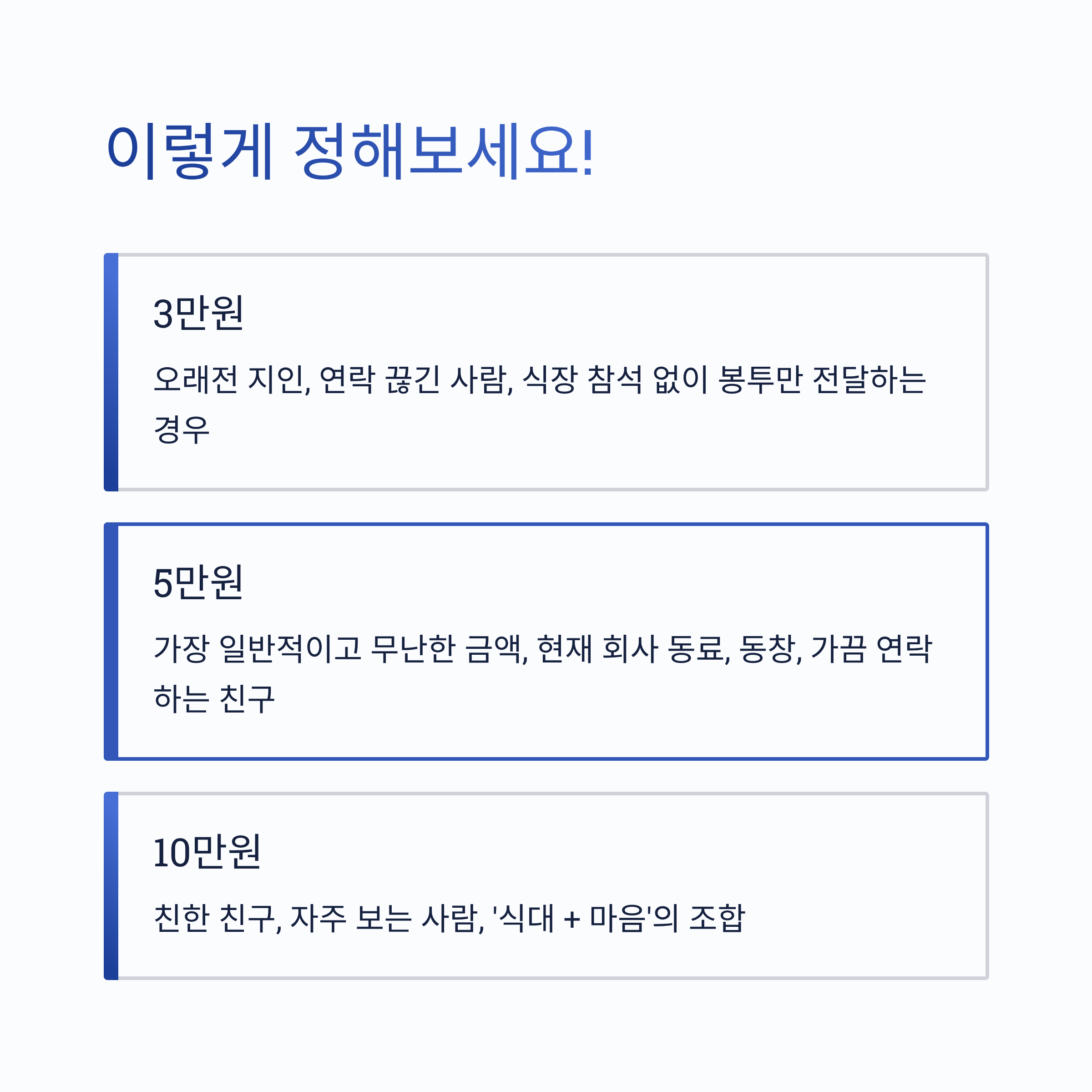 | 직장 동료, 지인 | 5만원 | 가장 보편적인 금액 |