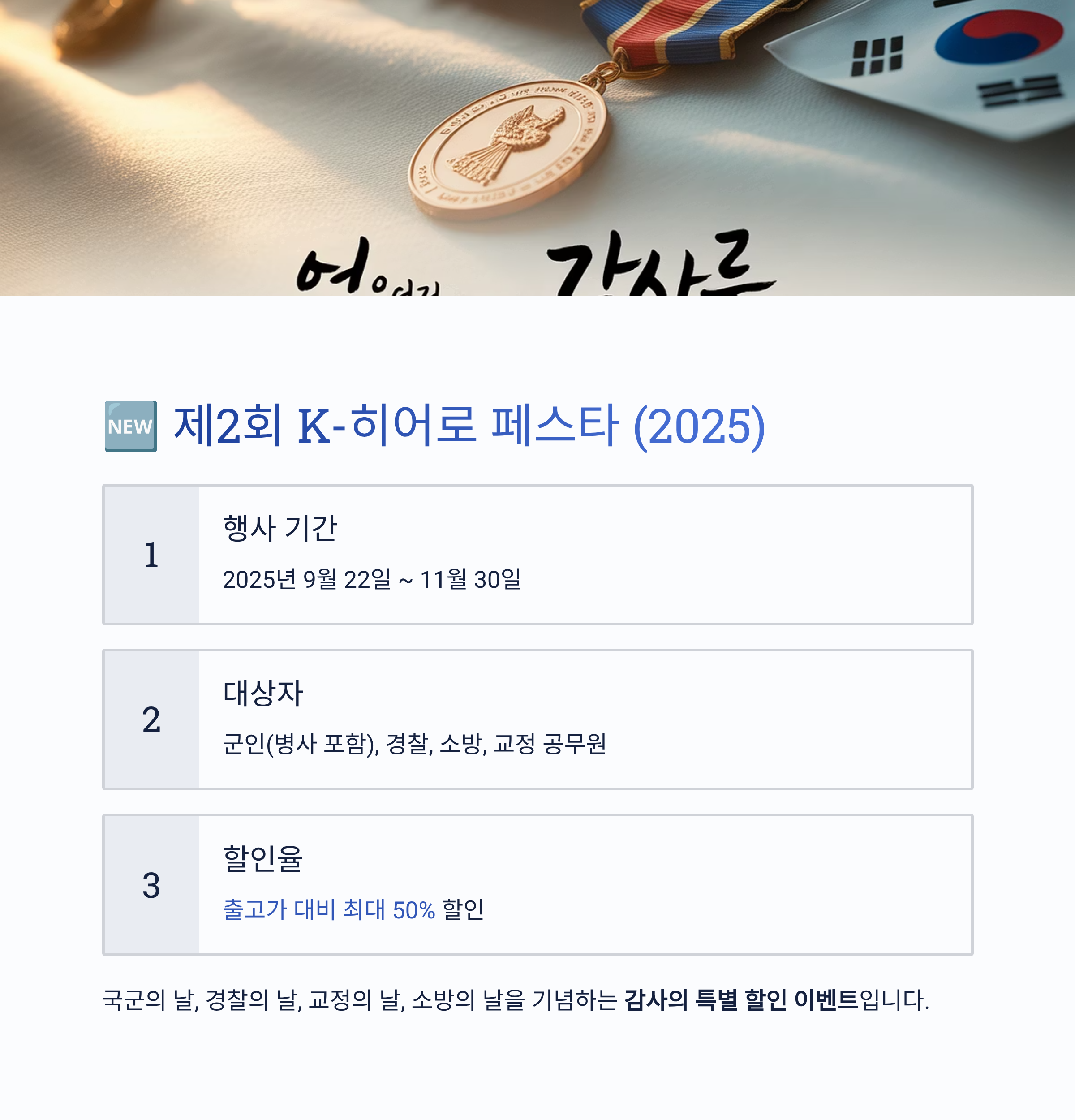 군인·경찰·소방·교정 공무원까지 포함한 ‘K-히어로 페스타’ 할인 행사를 11월 말까지 진행 중입니다.