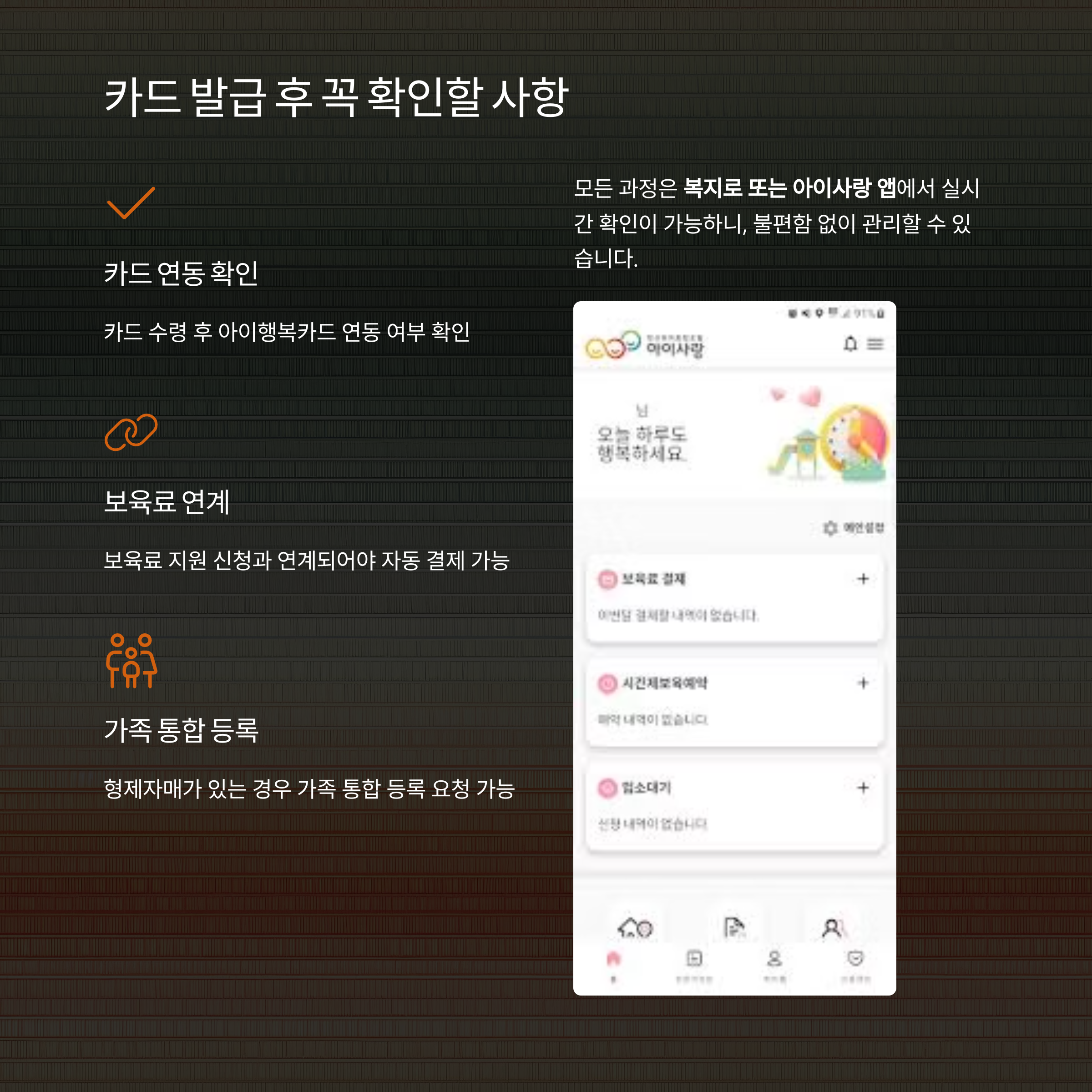 - 카드 수령 후 아이행복카드 연동 여부 확인