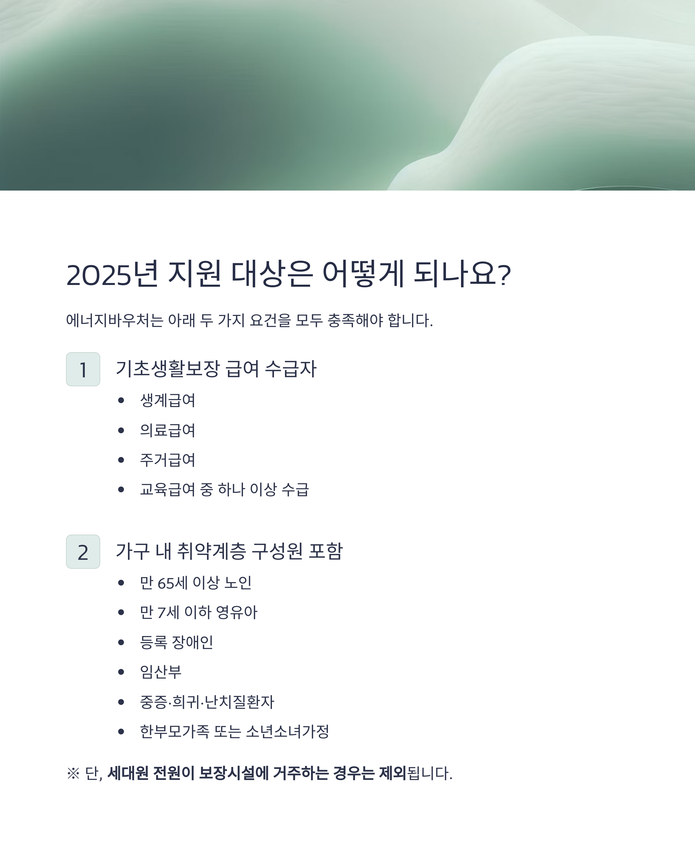 에너지바우처는 아래 두 가지 요건을 모두 충족해야 합니다.
