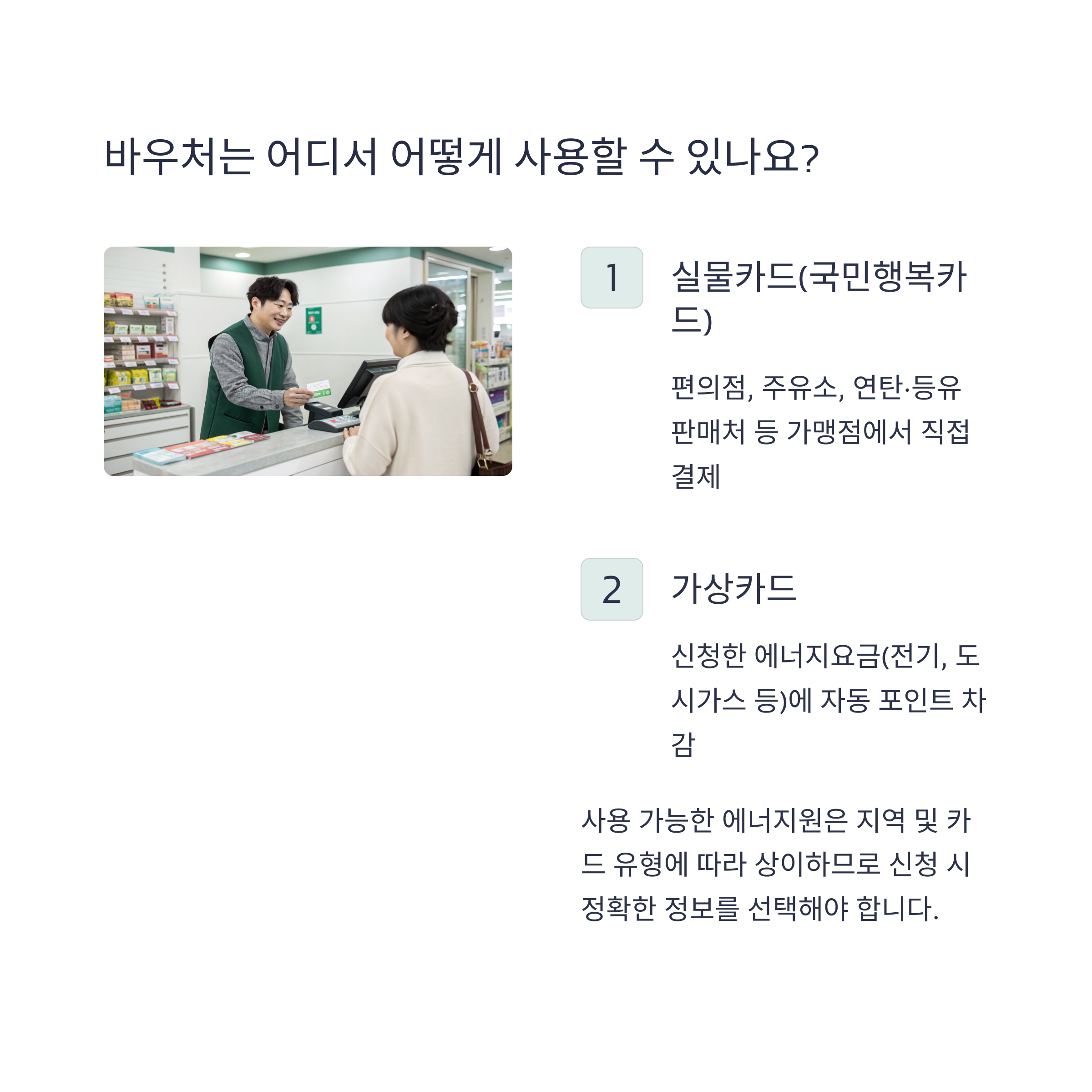 - 편의점, 주유소, 연탄·등유 판매처 등 가맹점에서 직접 결제
