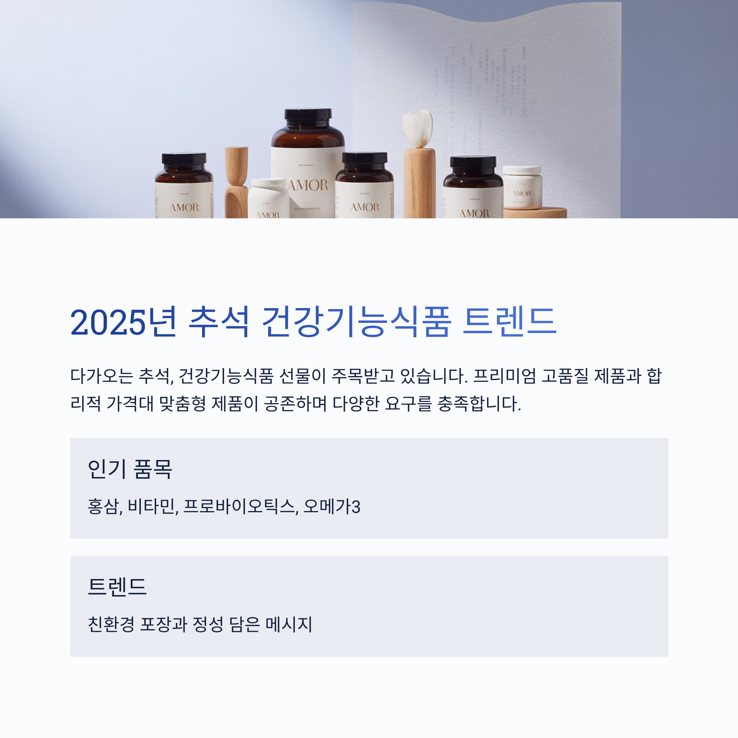 다가오는 2025년 추석, 건강기능식품 선물이 다시금 주목받고 있습니다. 올해는 프리미엄급 고품질 제품과 합리적인 가격대의 맞춤형 제품이 공존하며 소비자의 다양한 요구를 충족하고 있는데요. 홍삼, 비타민, 프로바이오틱스, 오메가3가 대표 인기 품목으로 꼽히며, 친환경 포장과 메시지를 담은 정성이 선물 만족도를 높이고 있습니다. 이번 글에서는 가격대별, 품목별, 선택 시 주의할 점까지 한눈에 정리해드립니다.