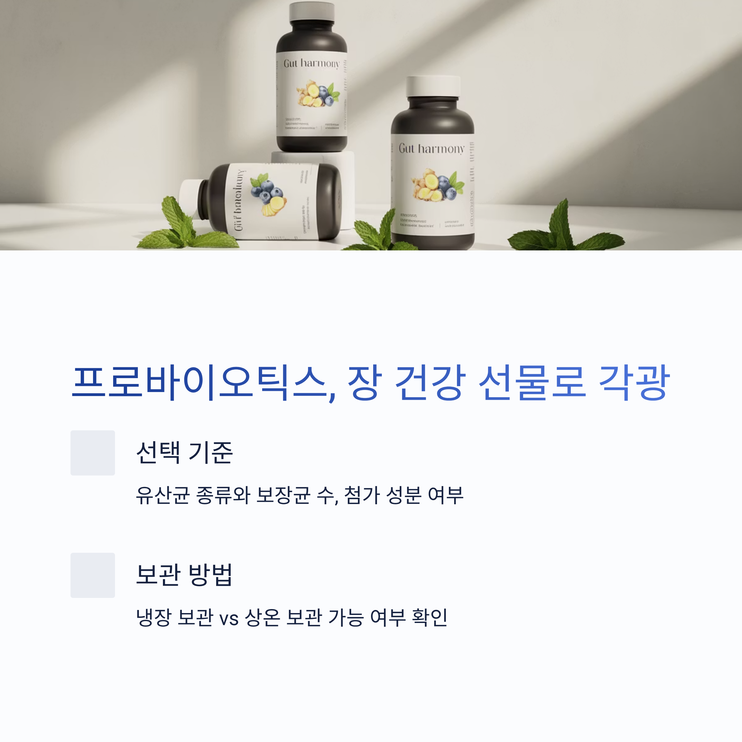 프로바이오틱스는 유산균 종류와 보장균 수, 첨가 성분 여부가 선택 기준으로 중요합니다. 또한 냉장 보관이 필요한 제품인지, 상온 보관이 가능한지에 따라 편의성이 달라지니 꼼꼼히 체크하는 것이 좋습니다.