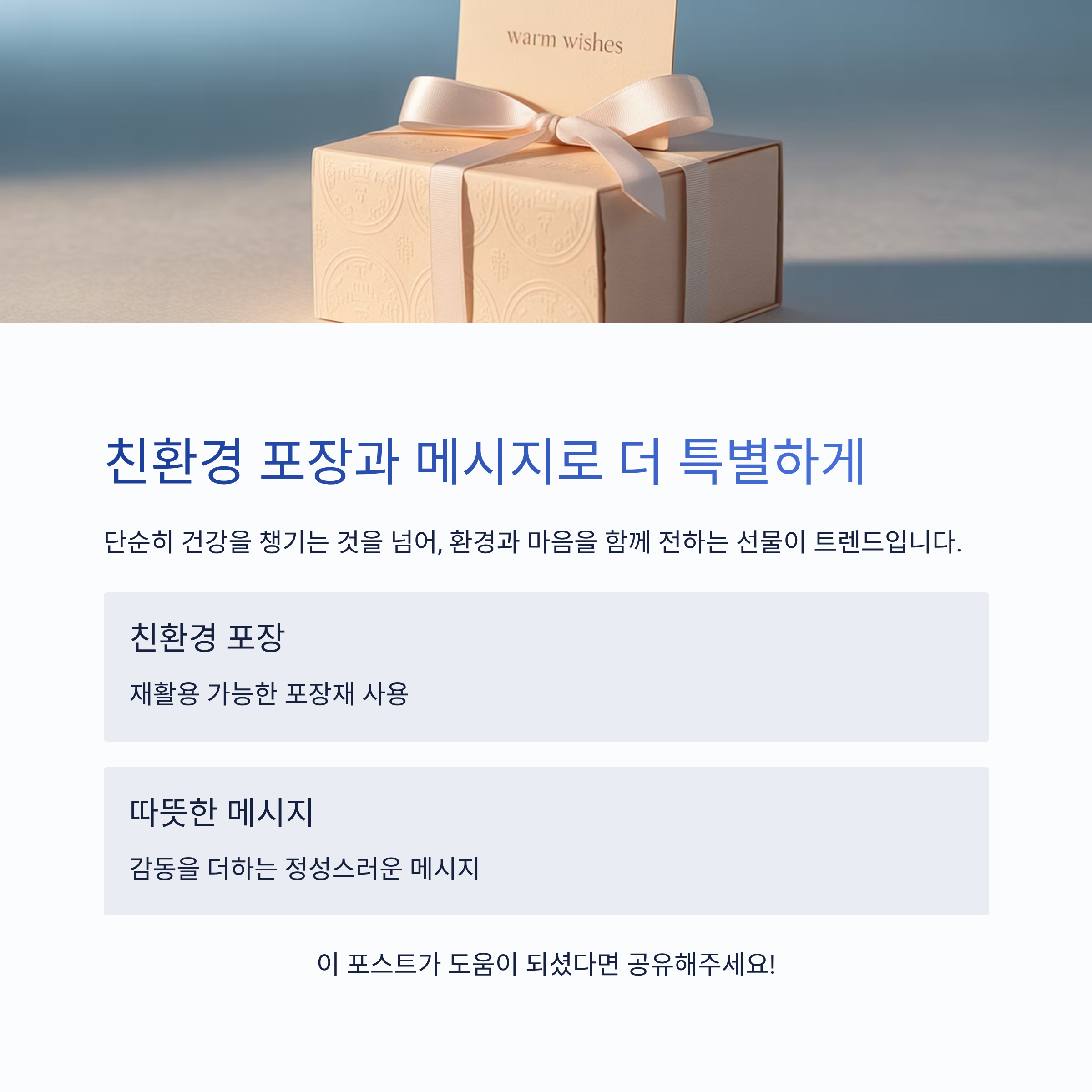 최근에는 단순히 건강을 챙기는 것을 넘어, 환경과 마음을 함께 전하는 선물이 트렌드입니다. 재활용 가능한 친환경 포장재와 따뜻한 메시지를 곁들여 선물하면 감동을 더할 수 있습니다.