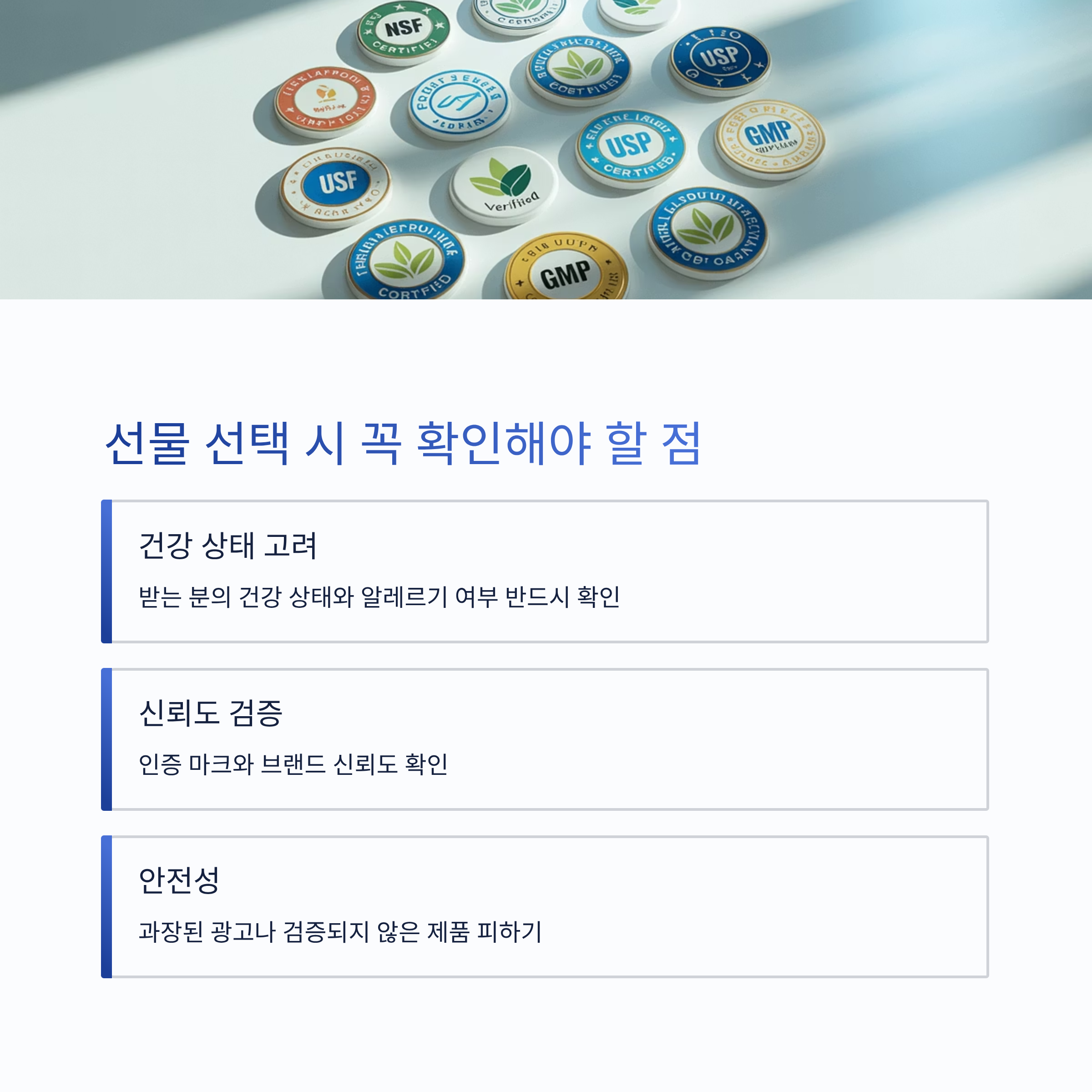 받는 분의 건강 상태와 알레르기 여부는 반드시 고려해야 합니다. 또한 인증 마크와 브랜드 신뢰도를 확인하고, 과장된 광고나 검증되지 않은 제품은 피하는 것이 안전합니다.