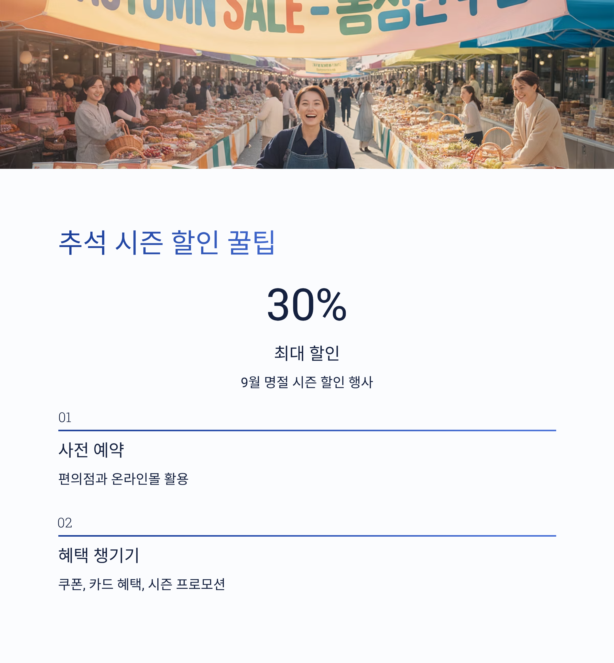 9월 명절 시즌에는 편의점과 온라인몰에서 사전 예약과 함께 최대 30%까지 할인 행사가 진행됩니다. 쿠폰, 카드 혜택, 시즌 프로모션을 꼼꼼히 챙기면 합리적인 가격으로 선물을 준비할 수 있습니다.