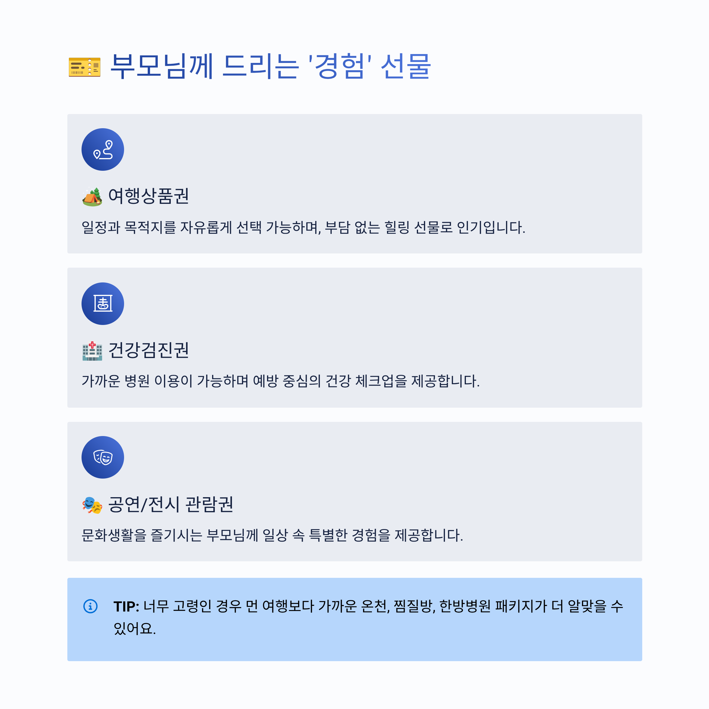 | 🎭 공연/전시 관람권 | 문화생활을 즐기시는 부모님께 일상 속 특별한 경험 제공 |