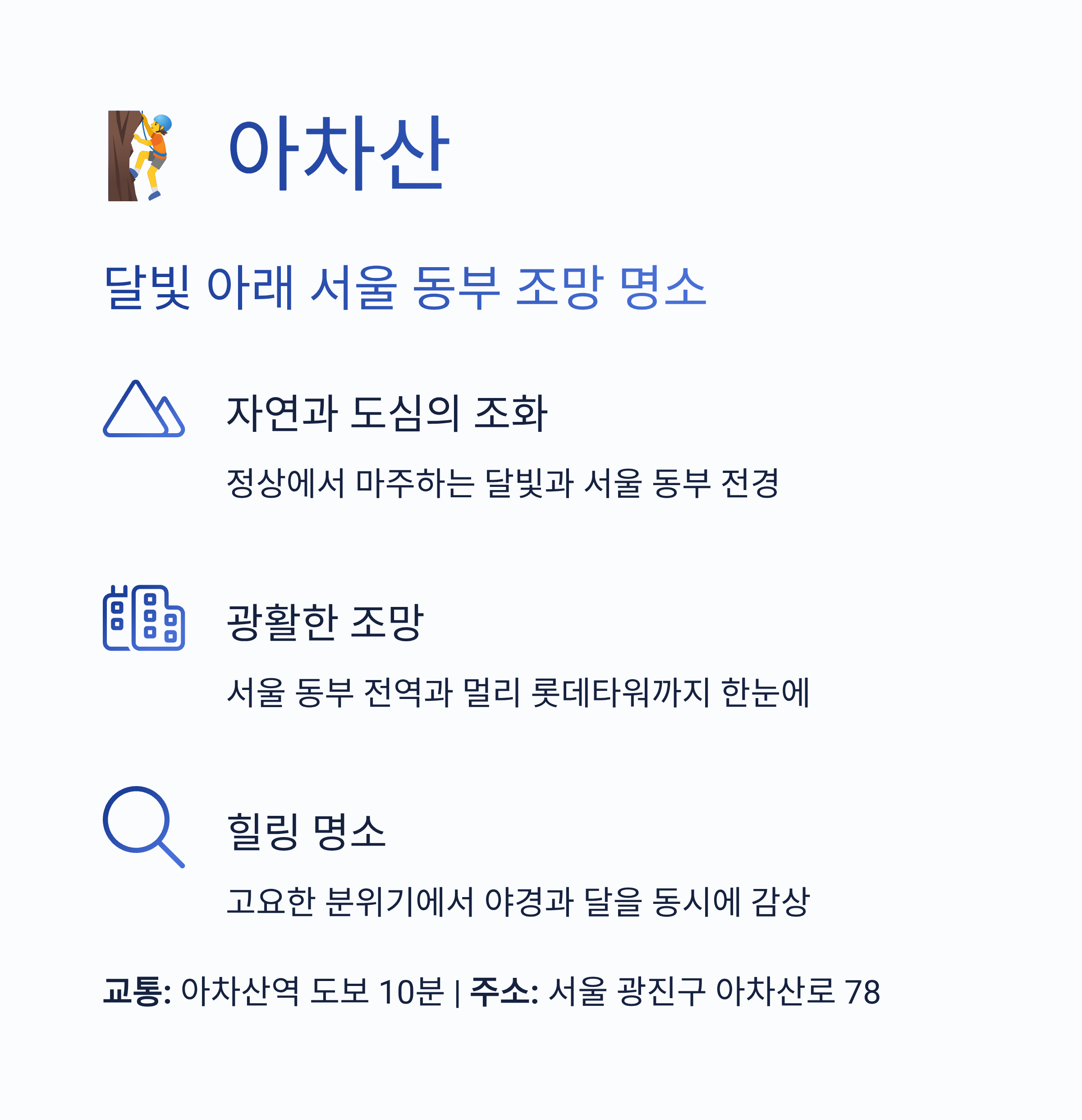 서울 동남부 야경을 한눈에 조망할 수 있으며, 밤 산책과 감성 사진 촬영지로 인기가 높습니다.