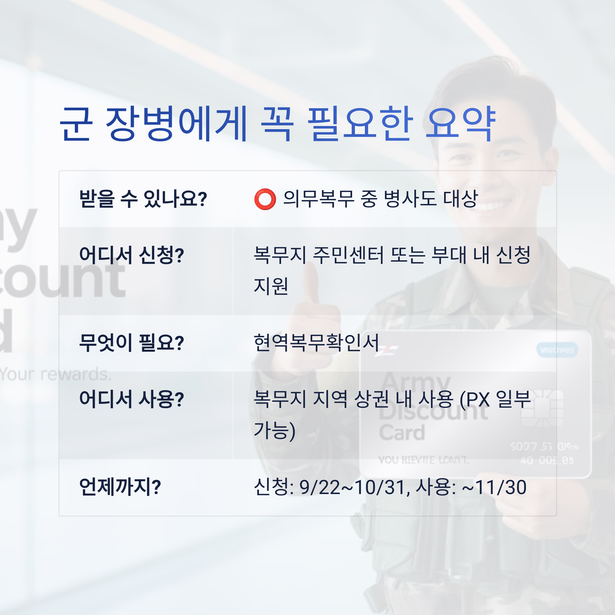 | 어디서 사용? | 복무지 지역 상권 내 사용 (PX 일부 가능) |