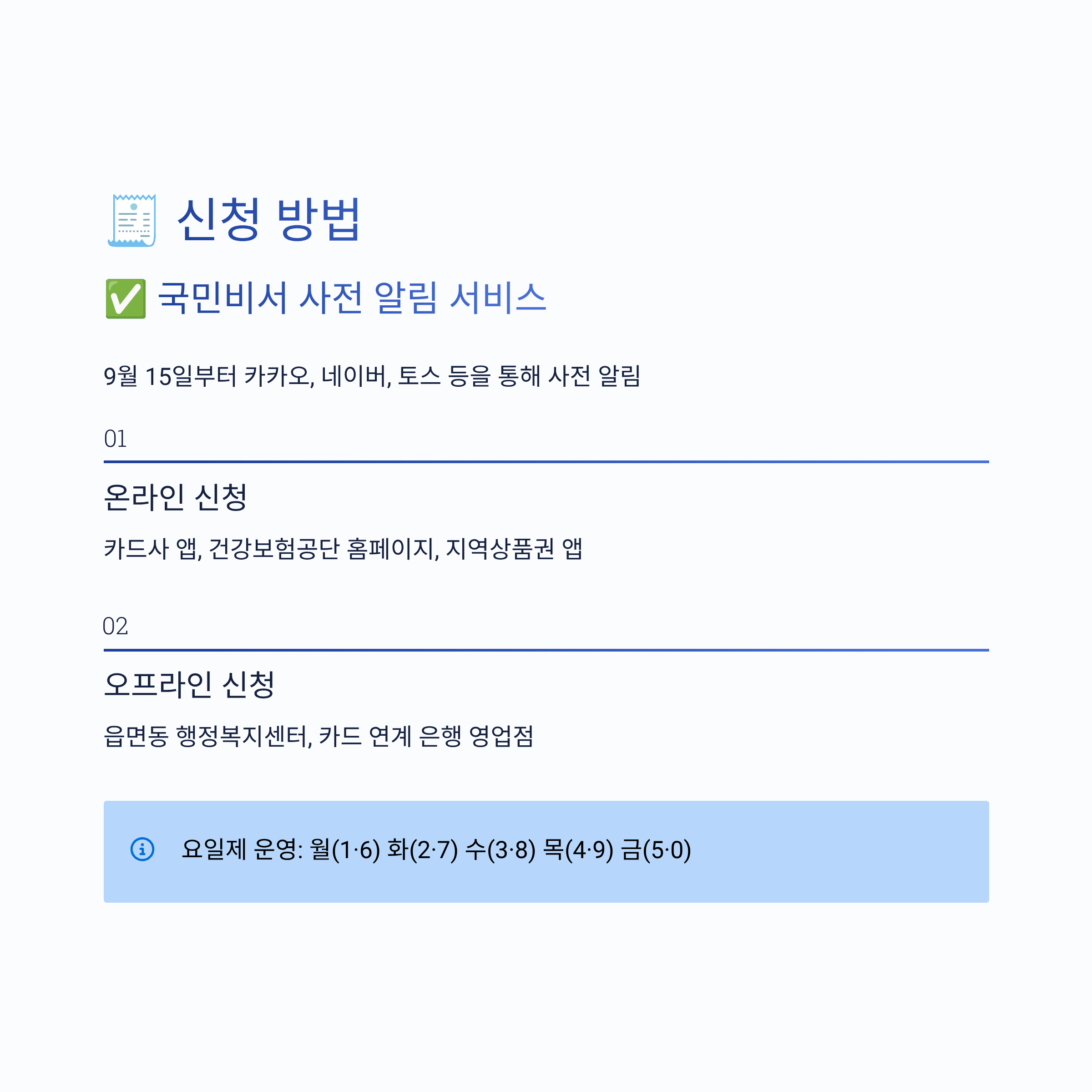 | 오프라인 | 읍면동 행정복지센터, 카드 연계 은행 영업점 |