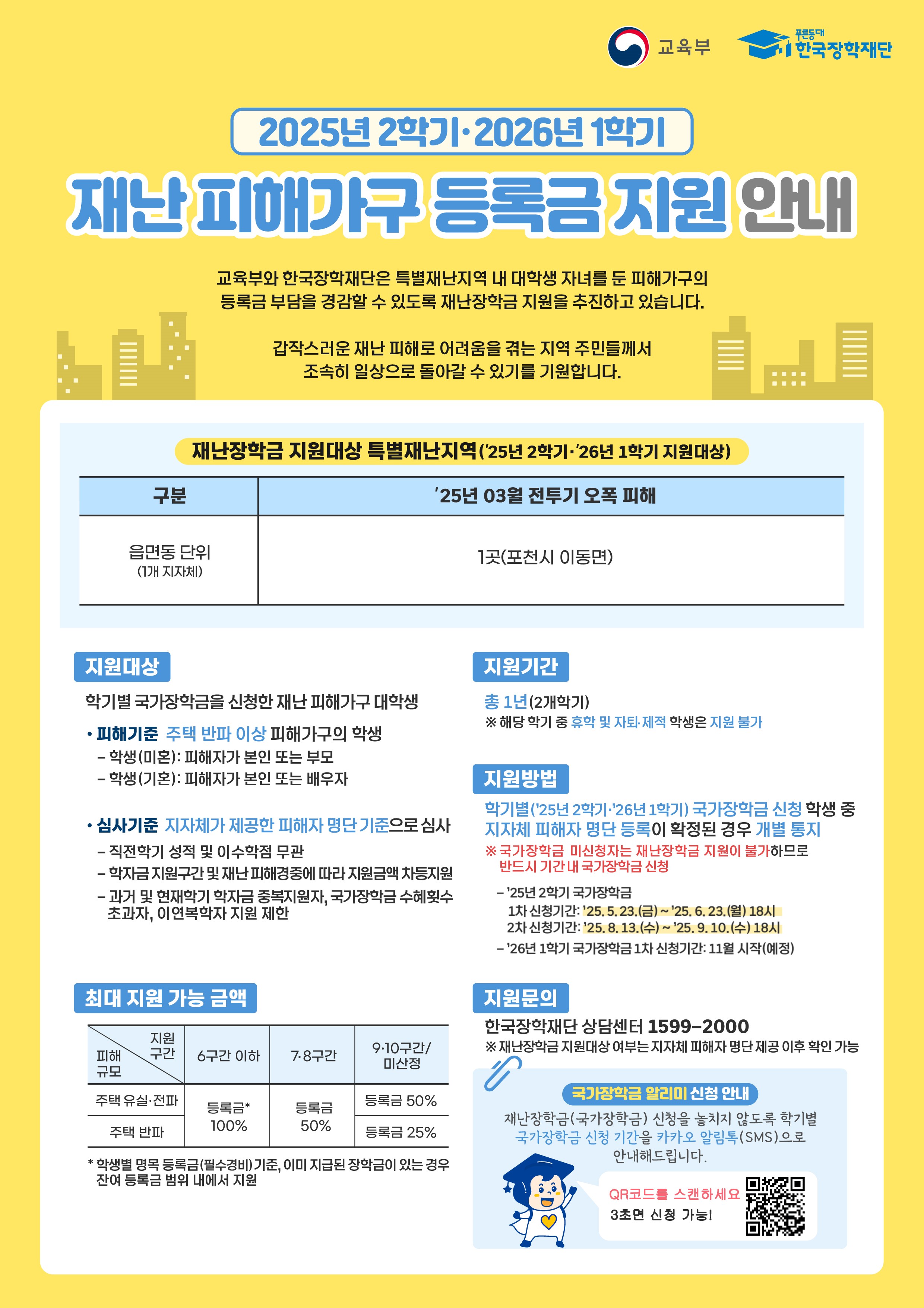 국가장학금 미신청자는 재난장학금 지원이 불가합니다. 특별재난지역 내 피해 가구 대학생은 꼭 국가장학금 2차 신청을 하셔야 해요!