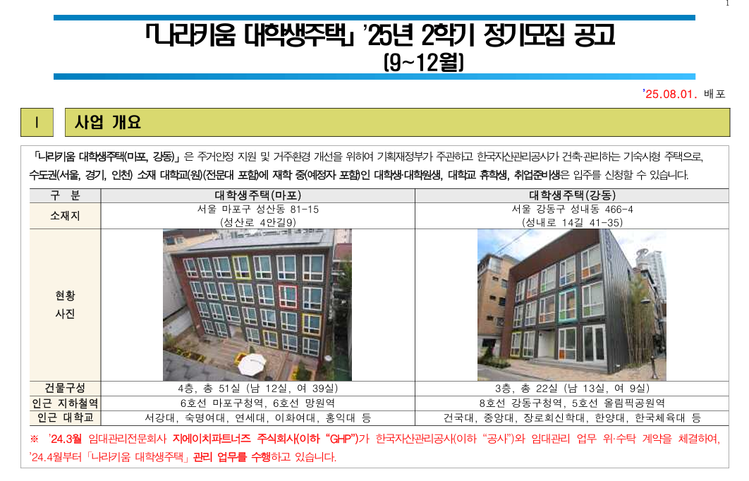 나라키움 대학생주택은 일반적인 기숙사와는 조금 다른 방식으로 운영돼요. 그래서 신청 기간, 모집 인원, 자격 조건 등이 학기마다 달라질 수 있으니, 반드시 해당 학기 공고문을 통해 정확한 내용을 확인하는 것이 중요합니다.