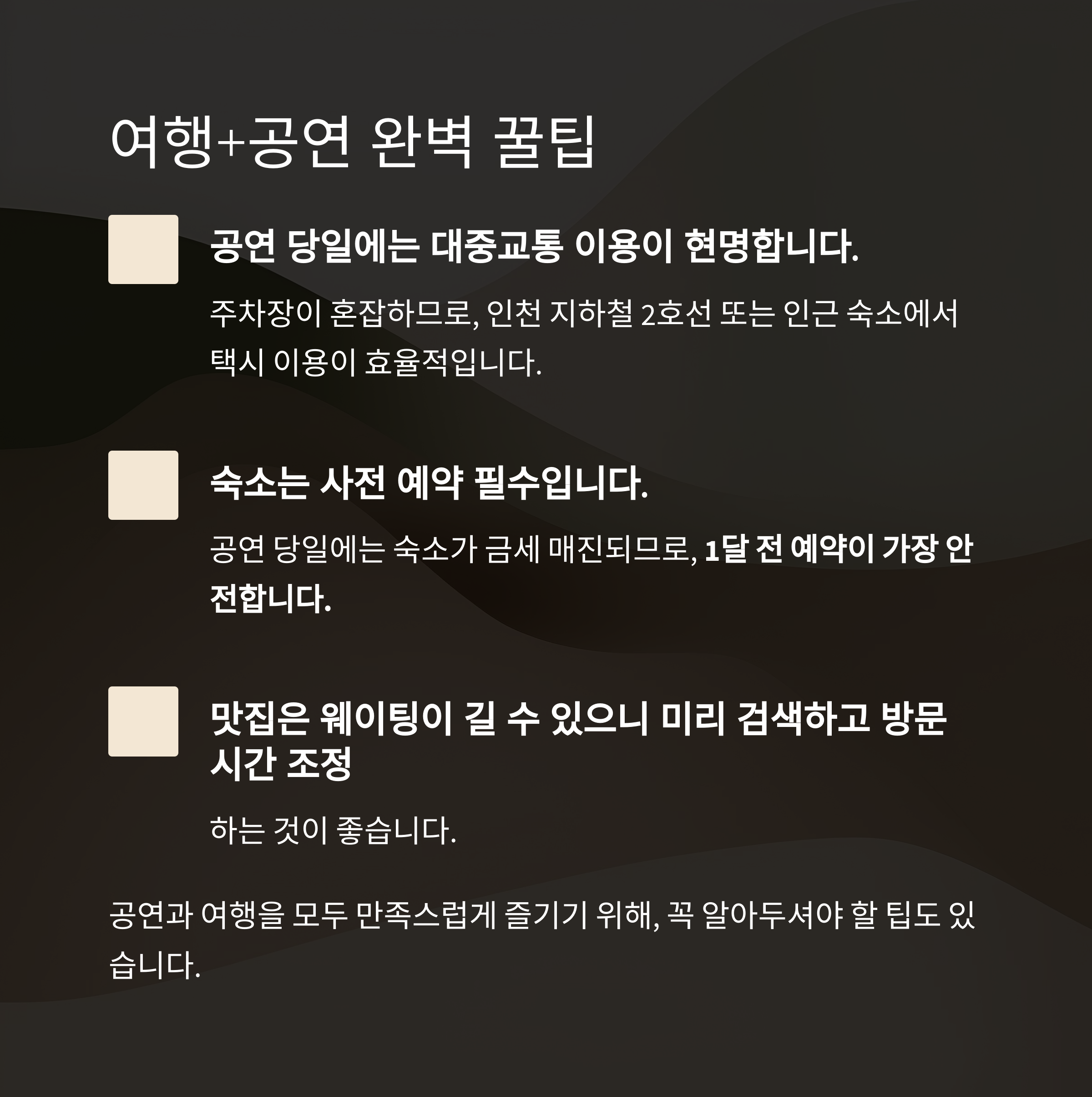 공연과 여행을 모두 만족스럽게 즐기기 위해, 꼭 알아두셔야 할 팁도 있습니다.
