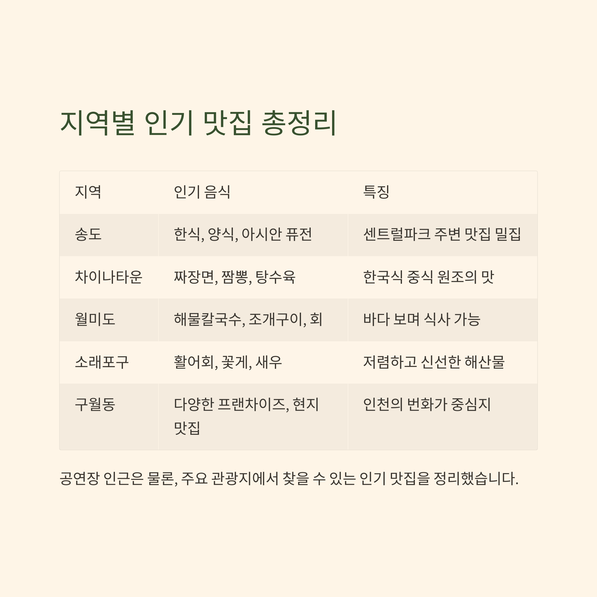 | 송도 | 한식, 양식, 아시안 퓨전 | 센트럴파크 주변 맛집 밀집 |