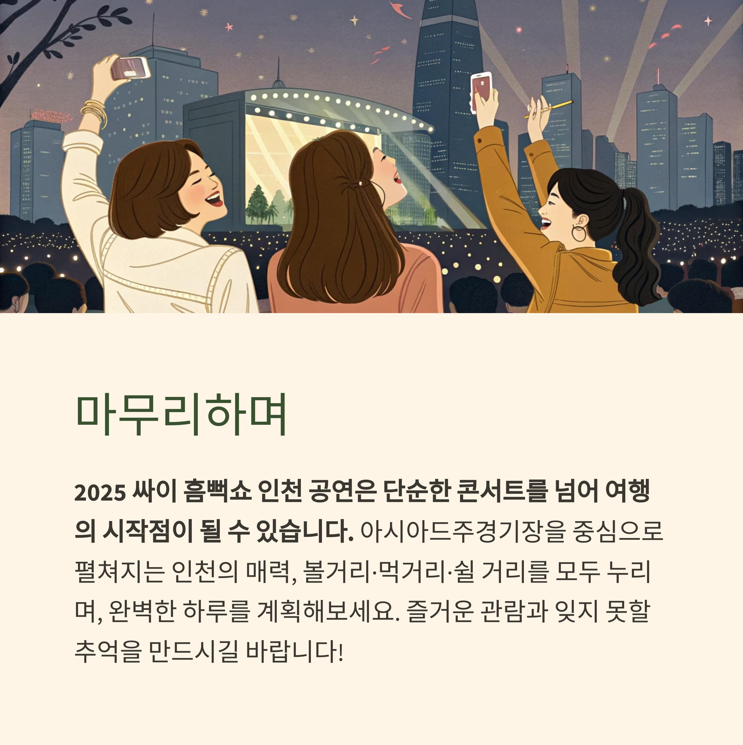 2025 싸이 흠뻑쇼 인천 공연은 단순한 콘서트를 넘어 여행의 시작점이 될 수 있습니다.