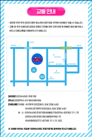 공연 장소는 인천 아시아드 주경기장으로, 대중교통과 주차 모두 용이한 위치입니다.