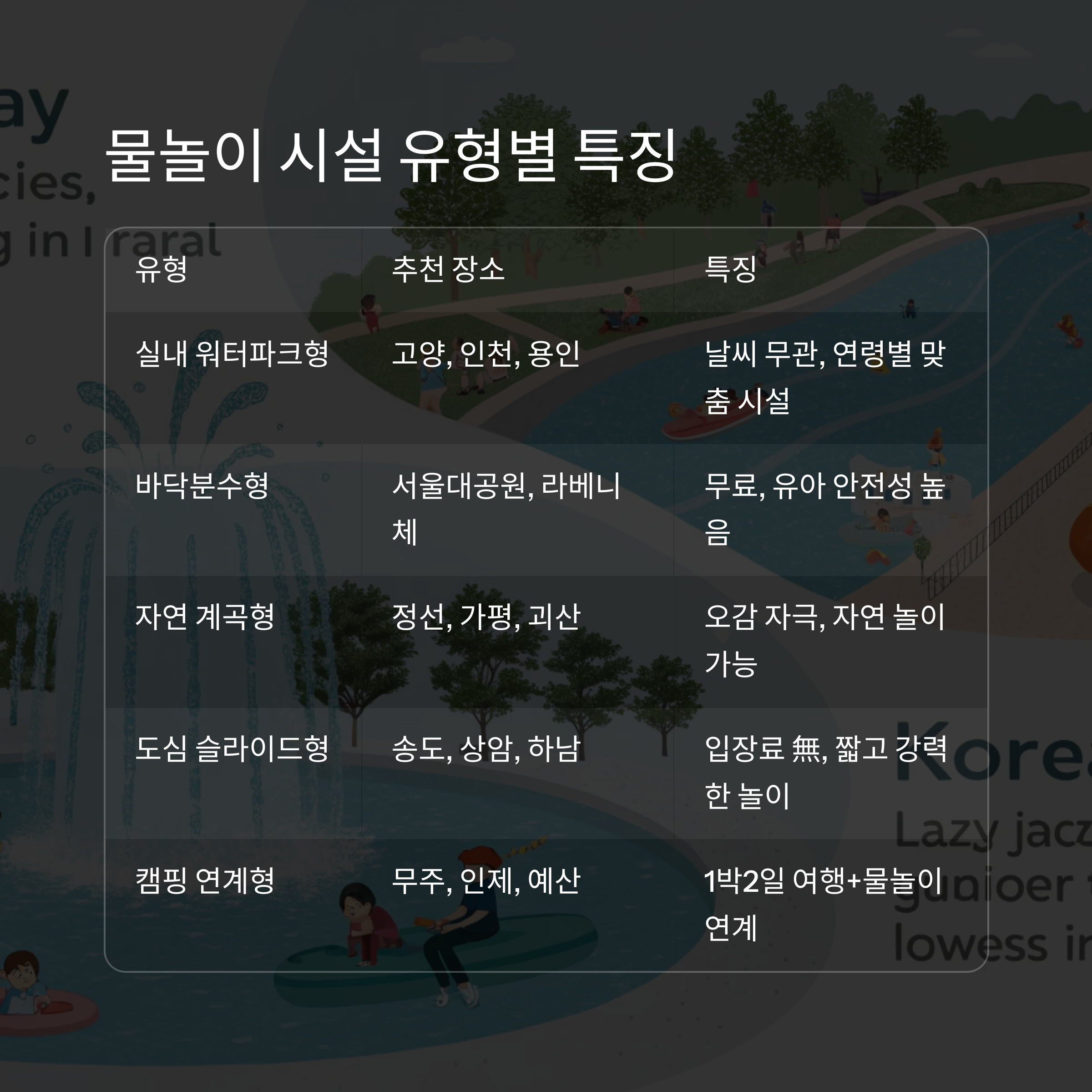 | 실내 워터파크형 | 고양, 인천, 용인 등 대형 워터파크 | 날씨 무관, 연령별 맞춤 시설 |