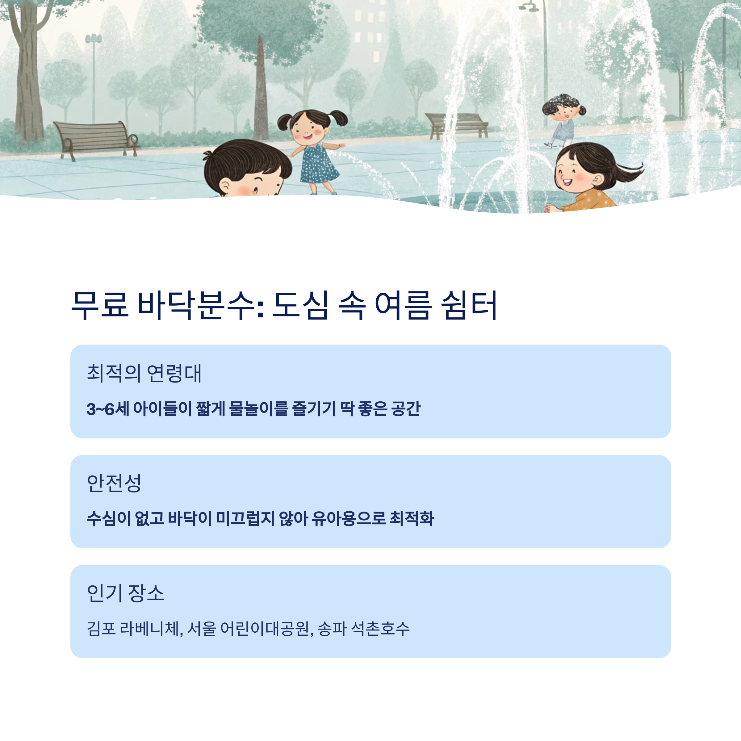 | 바닥분수형 | 서울대공원, 라베니체, 석촌호수 | 무료, 유아 안전성 높음 |