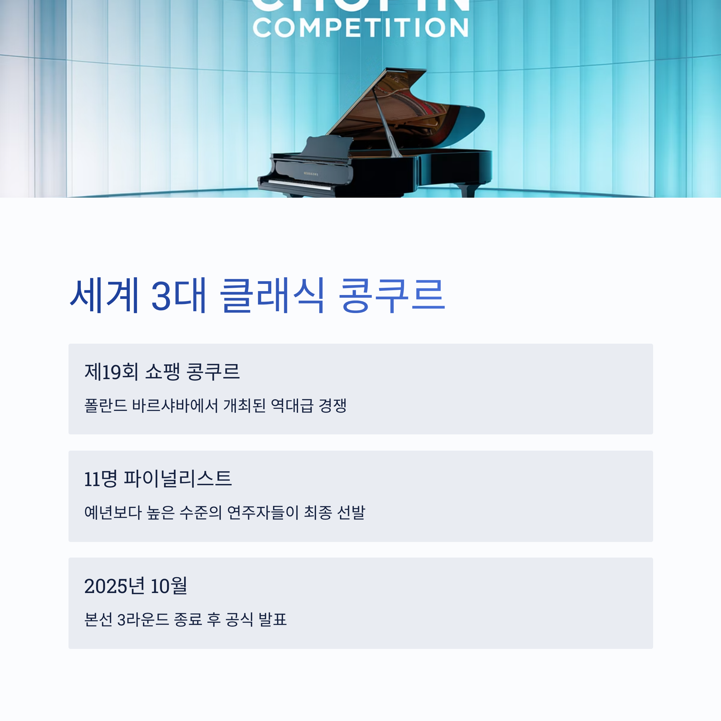 세계 3대 클래식 음악 콩쿠르 중 하나인 제19회 쇼팽 국제 피아노 콩쿠르(Chopin Competition 2025)의 결선 진출자 명단이 공개되었습니다.