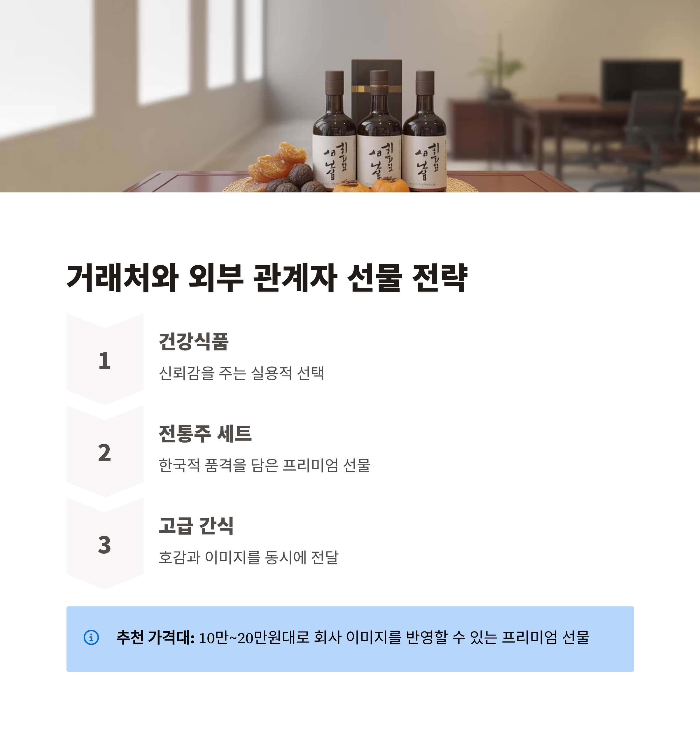 | 거래처 | 건강식품, 전통주 세트 | 10~20만 원대 | 신뢰와 이미지 강화 |