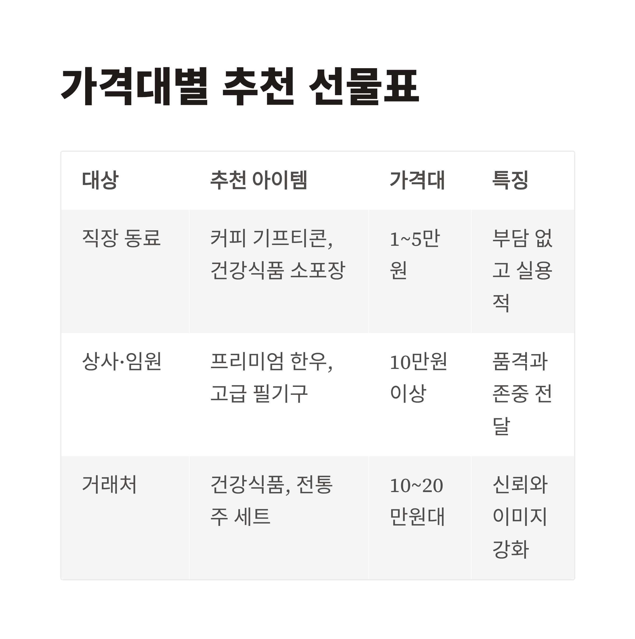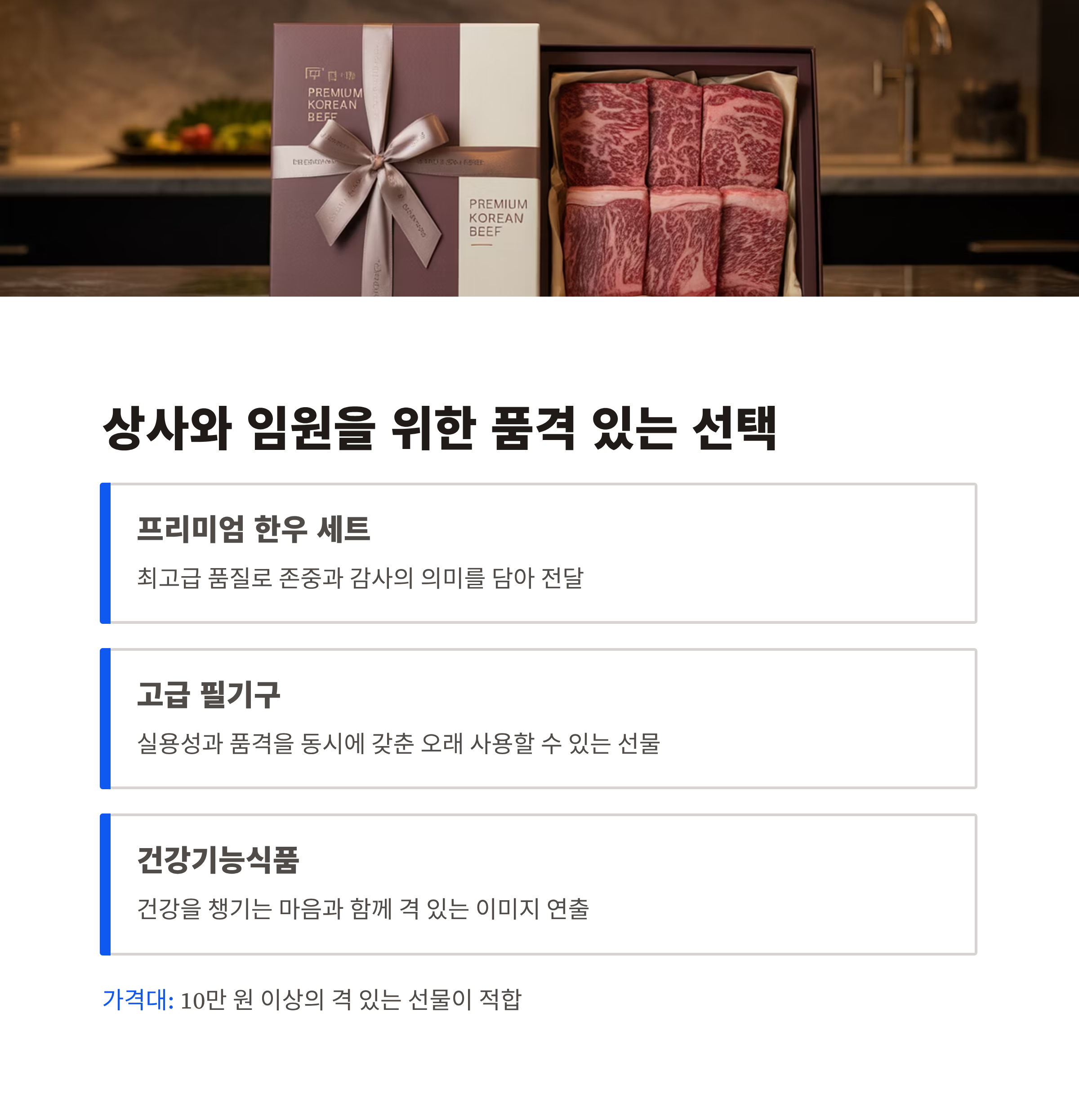 | 상사·임원 | 프리미엄 한우, 고급 필기구 | 10만 원 이상 | 품격과 존중 전달 |