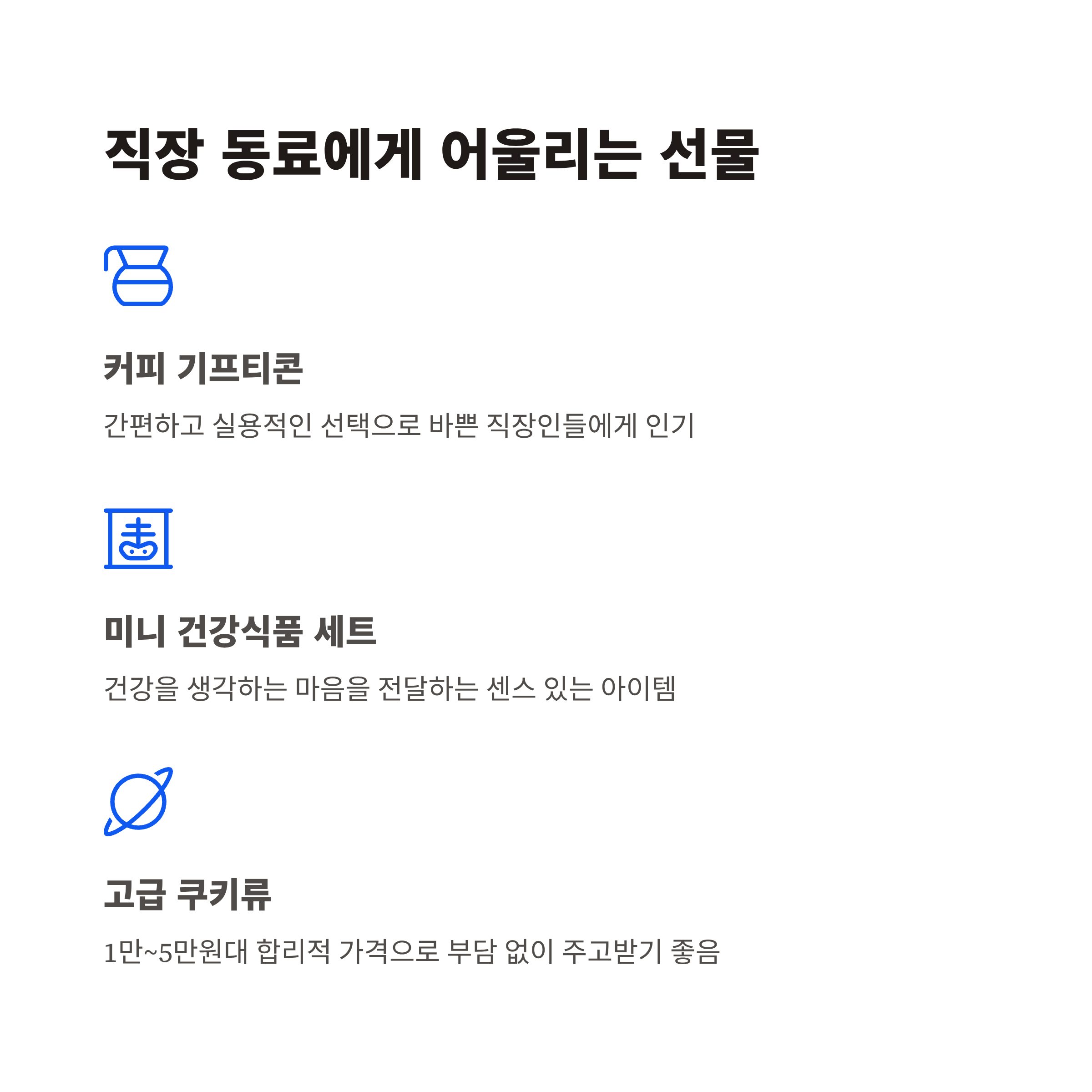 | 직장 동료 | 커피 기프티콘, 건강식품 소포장 | 1~5만 원 | 부담 없고 실용적 |