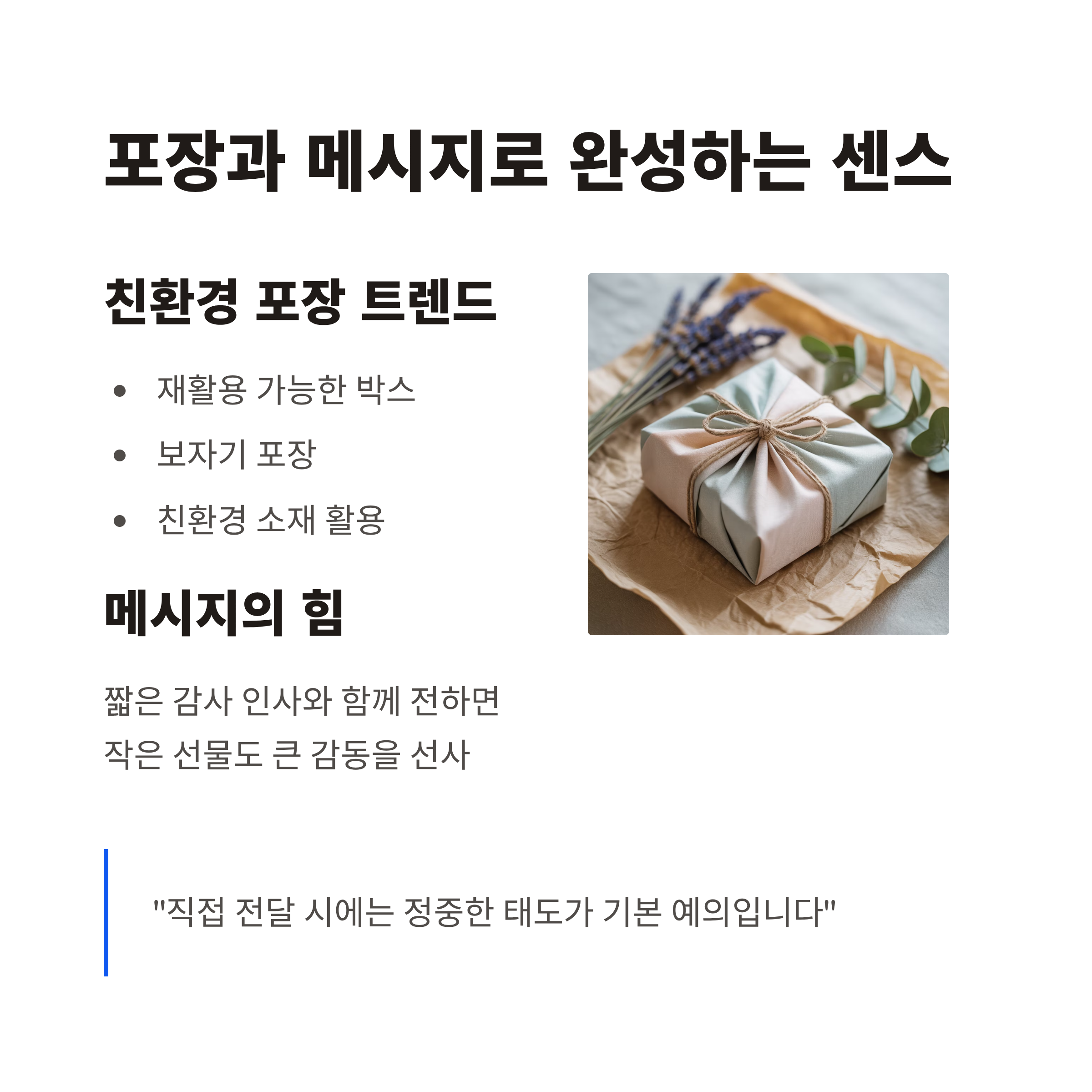 재활용 가능한 박스나 보자기 포장은 최근 친환경 트렌드를 반영합니다. 짧은 감사 인사와 함께 전하면 작은 선물이라도 큰 감동을 줄 수 있습니다. 직접 전달 시에는 정중한 태도가 기본 예의입니다.