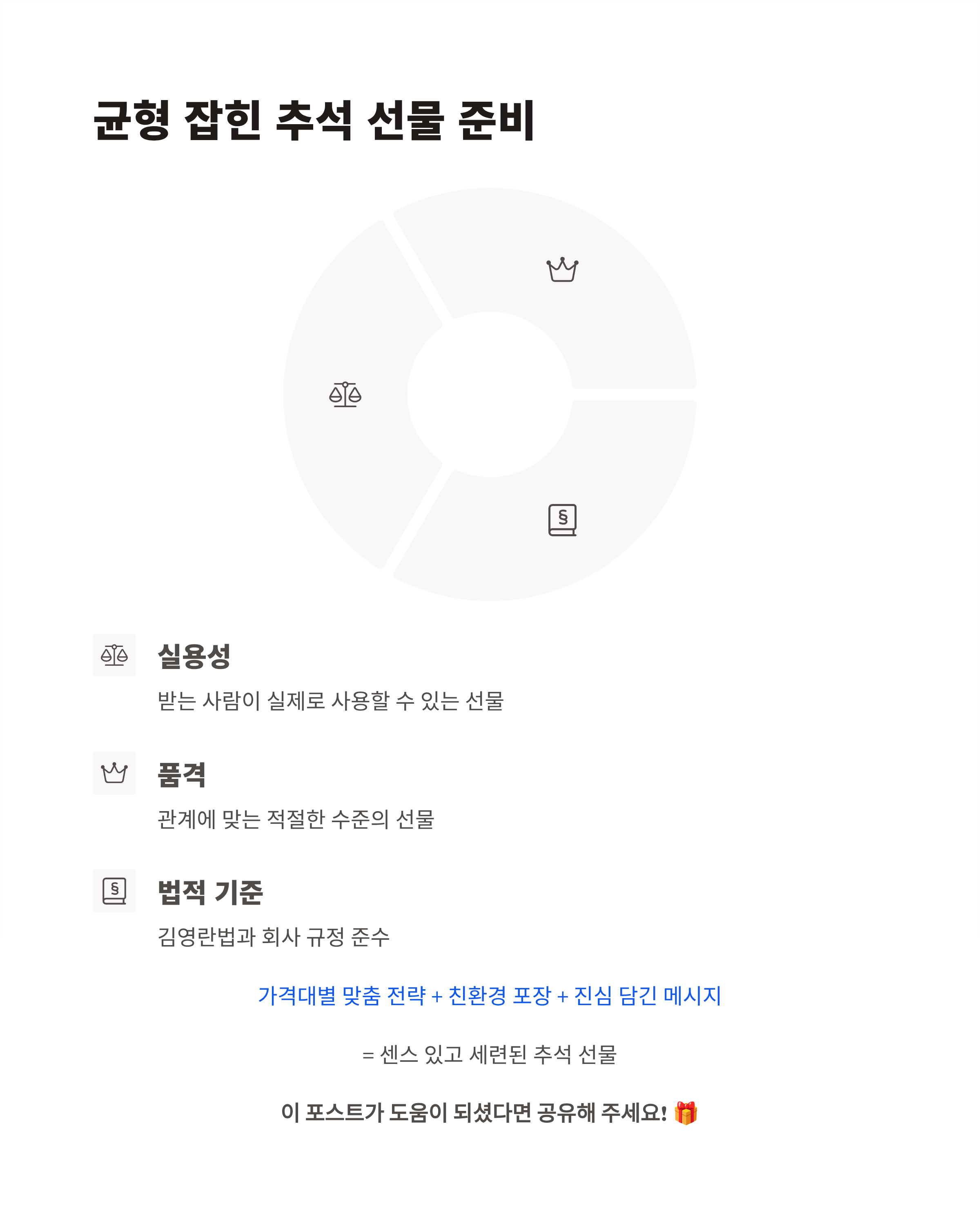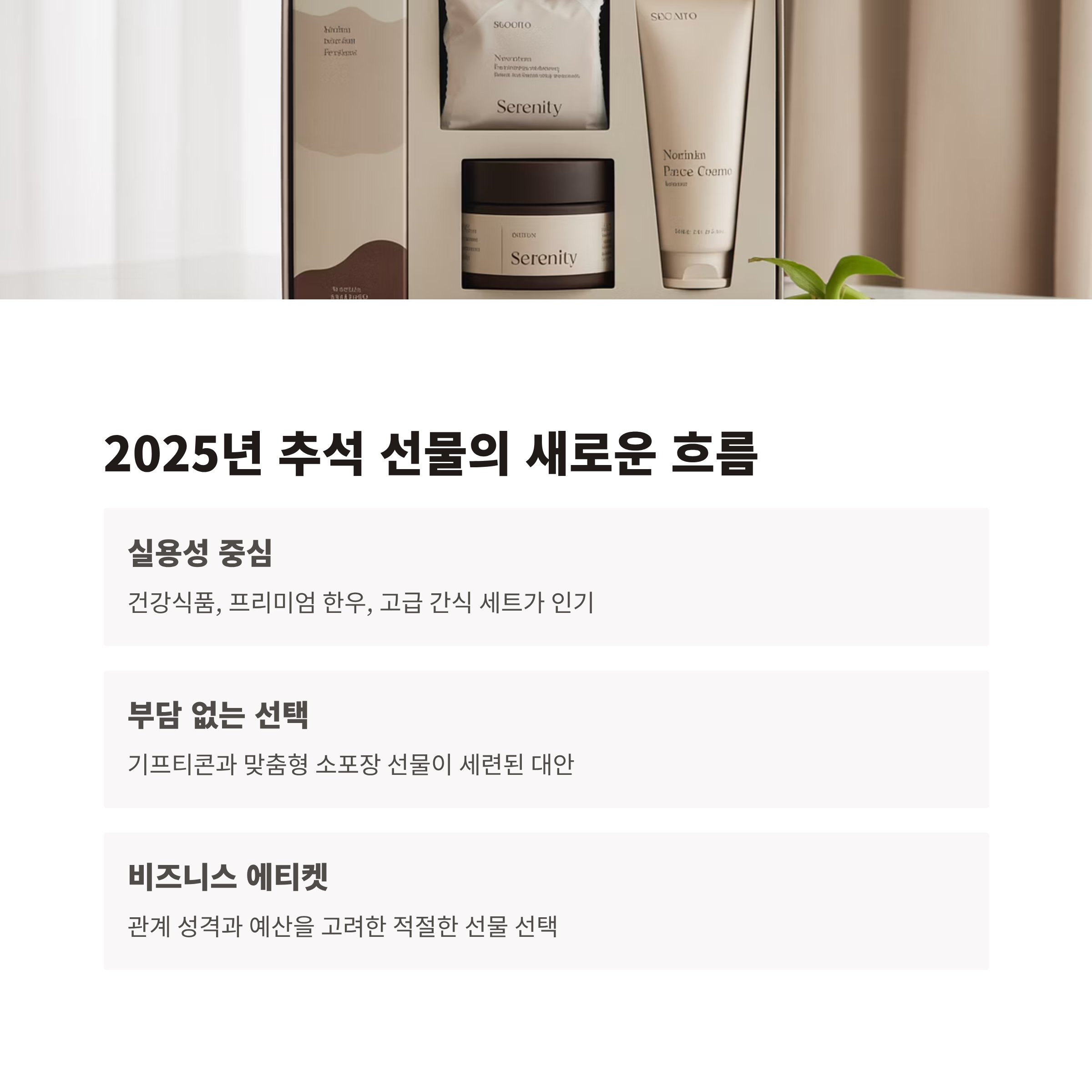 2025년 추석 선물은 실용성과 품격, 그리고 법적 기준을 모두 충족해야 성공적입니다. 가격대별 맞춤 전략을 세우고 친환경 포장과 메시지를 더한다면, 센스 있고 세련된 선물로 오래 기억될 수 있습니다.