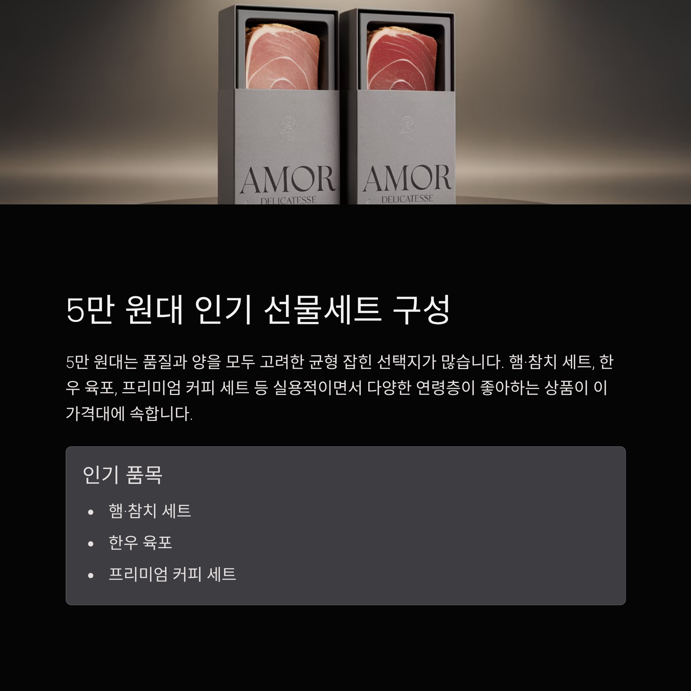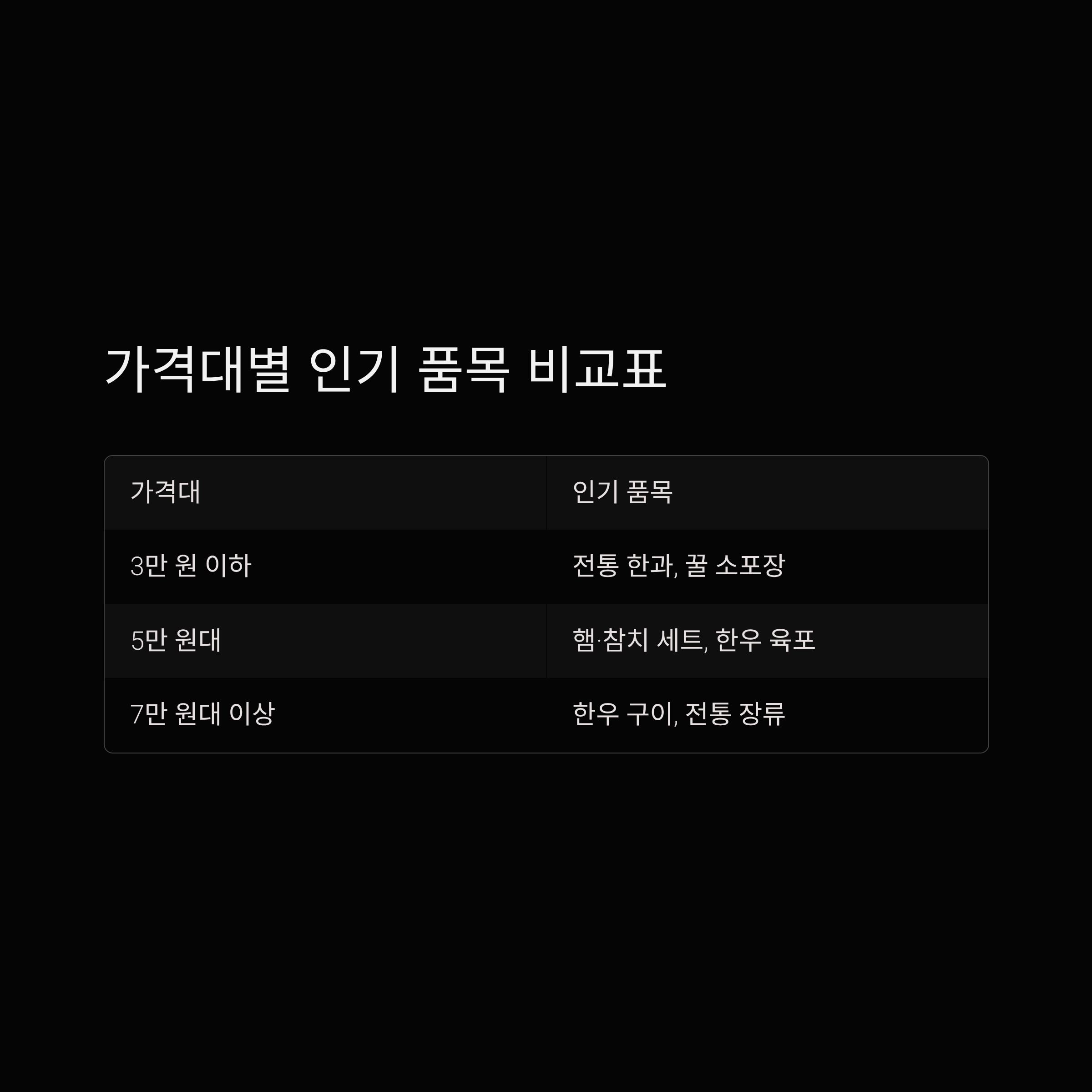 | 5만 원대 | 햄·참치 세트, 한우 육포 |
