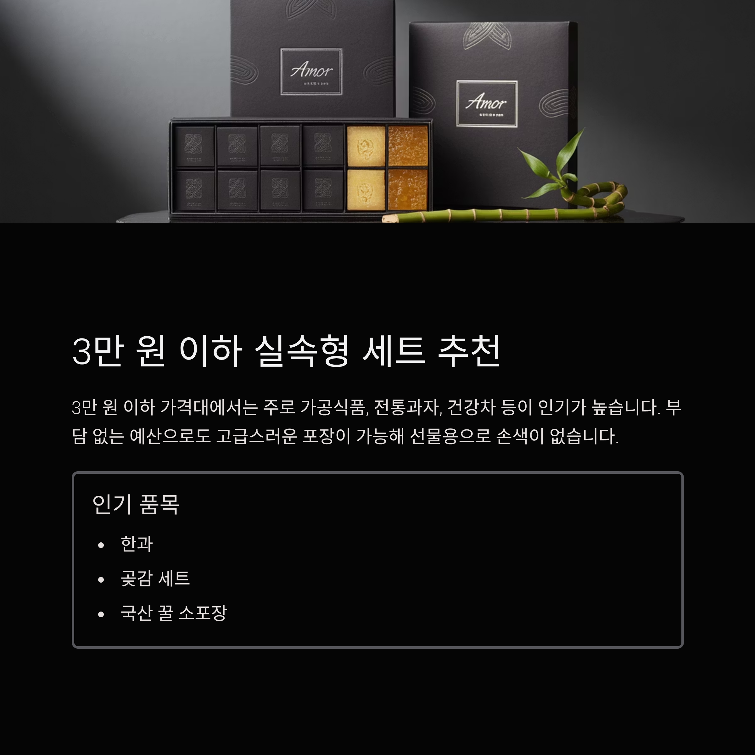 3만 원 이하 가격대에서는 주로 가공식품, 전통과자, 건강차 등이 인기가 높습니다.
